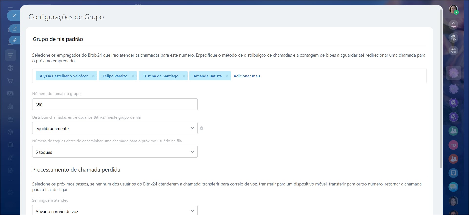 Use essas configurações para editar o grupo de usuários da telefonia que receberá as chamadas. Você pode especificar um ou mais responsáveis, bem como configurar o tipo de distribuição.