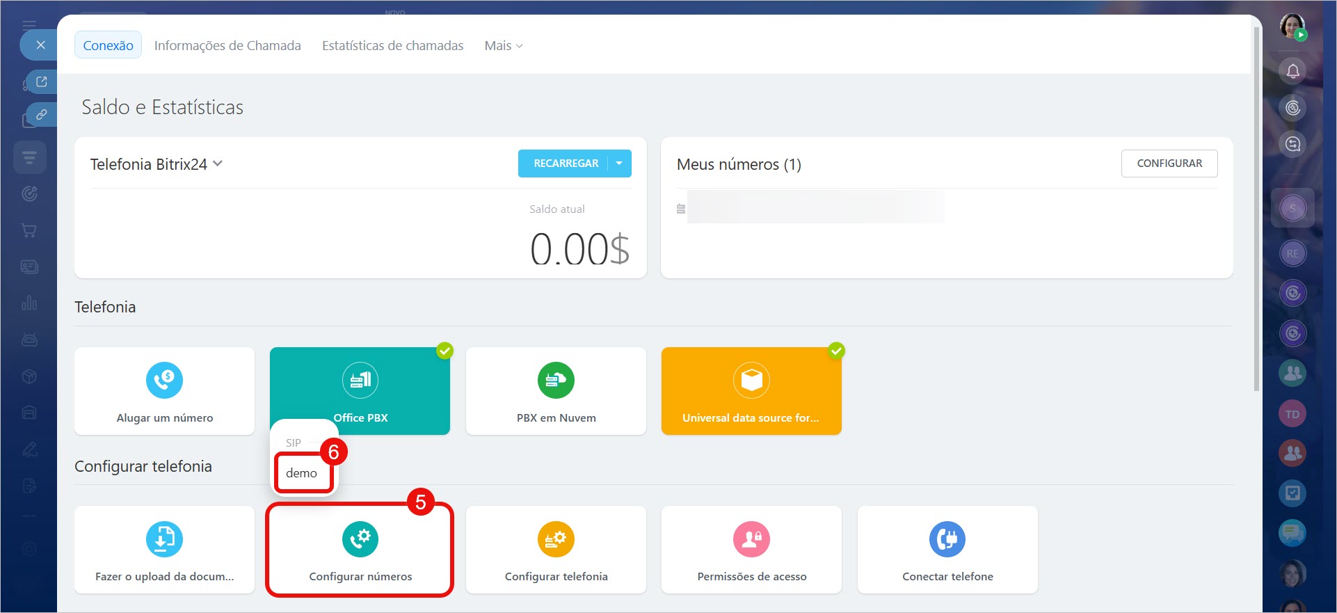 5-6. Clique no bloco Configurar números. Selecione um número alugado ou seu PBX.