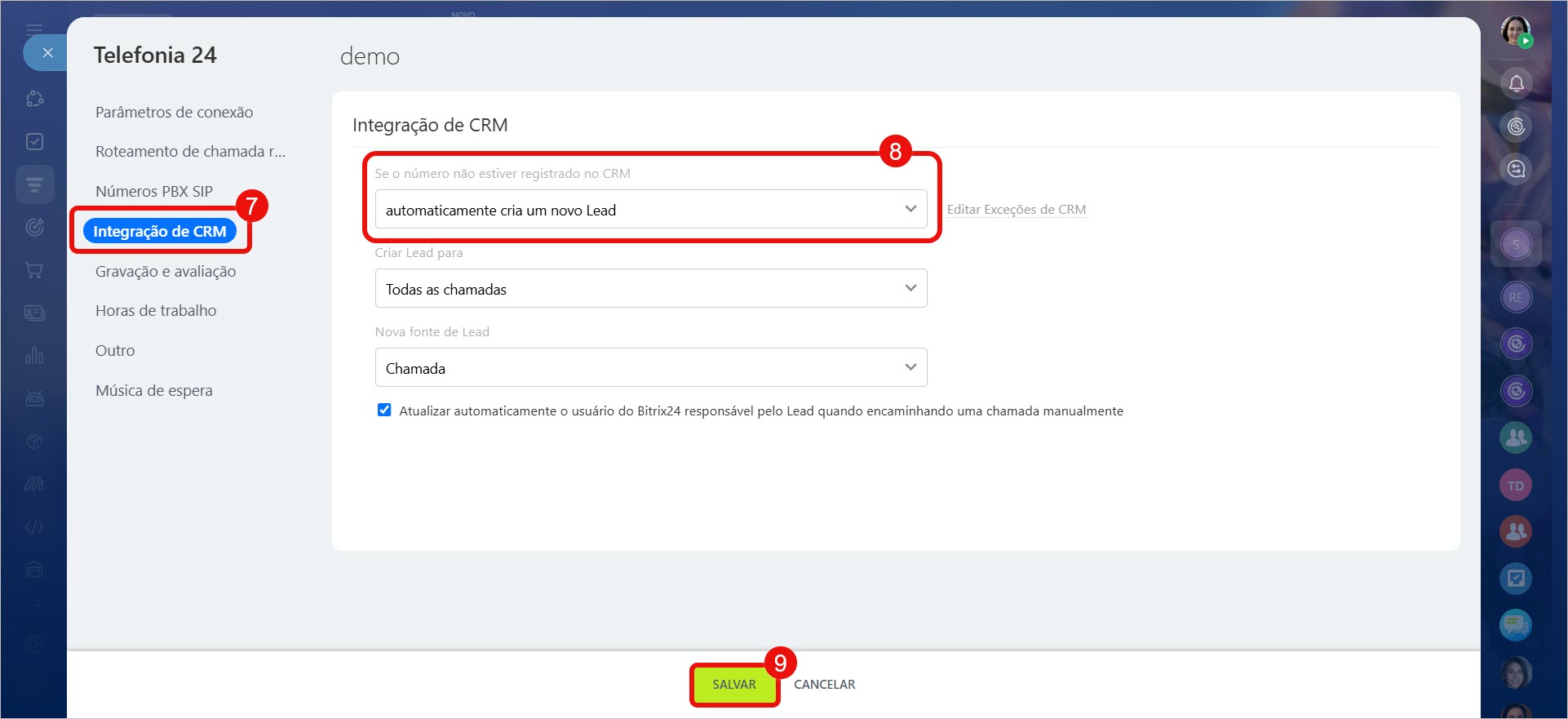 7-9. Abra a aba Integração de CRM. Ative a opção para criar automaticamente um novo lead caso o número não esteja registrado no CRM. Na prática, o sistema criará novos negócios, já que você utiliza o modo do CRM Simples. Salve as alterações.