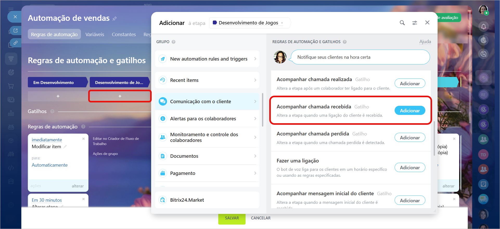 Automação de vendas no CRM - Na etapa Desenvolvimento de Jogos, clique em Mais (+) e adicione o gatilho Acompanhar chamada recebida.