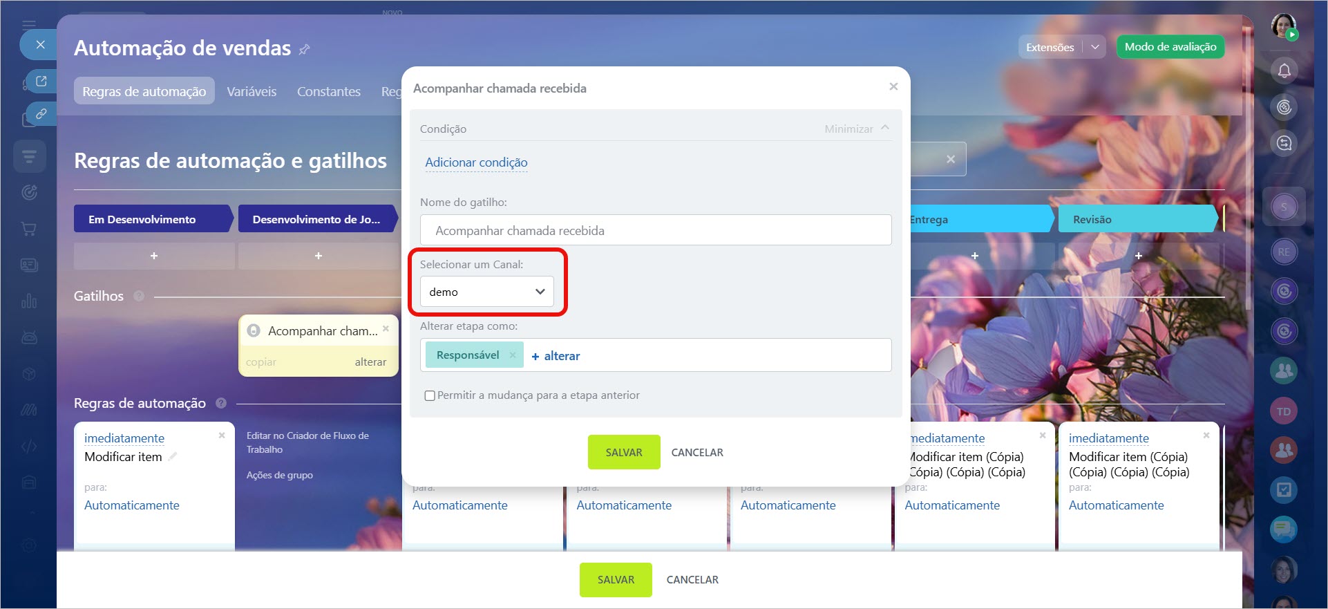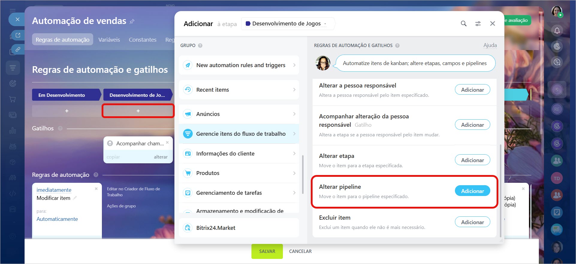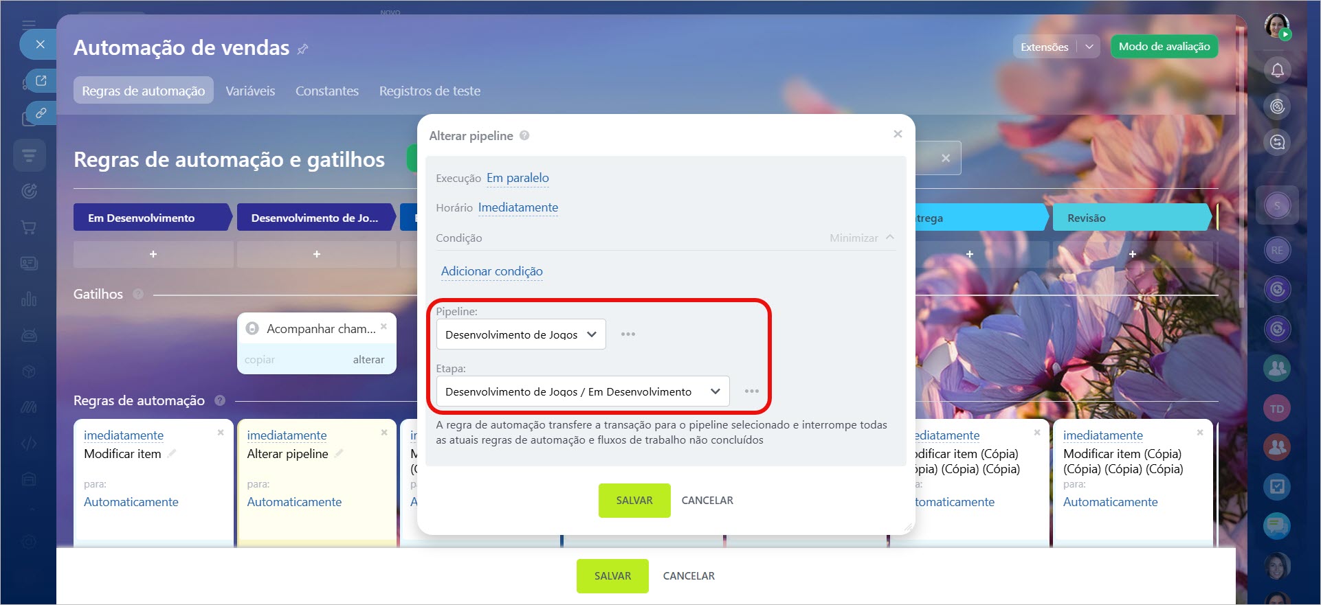 - Adicione a regra de automação Alterar pipeline na mesma etapa.