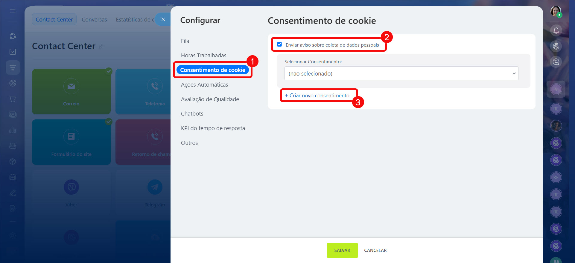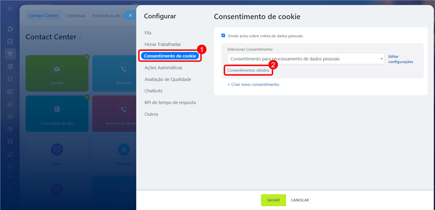 1-3. Abra o CRM > Clientes > Contact Center. 4. Clique em um canal de comunicação qualquer. 5. Selecione um Canal Aberto existente ou crie um novo. 6. Clique em Configurar.