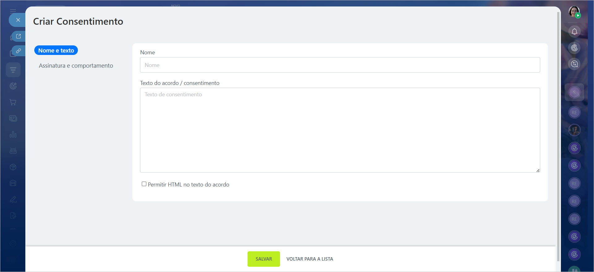 - Texto do acordo / consentimento. Adicione o texto da Política de Privacidade que será exibido aos clientes.