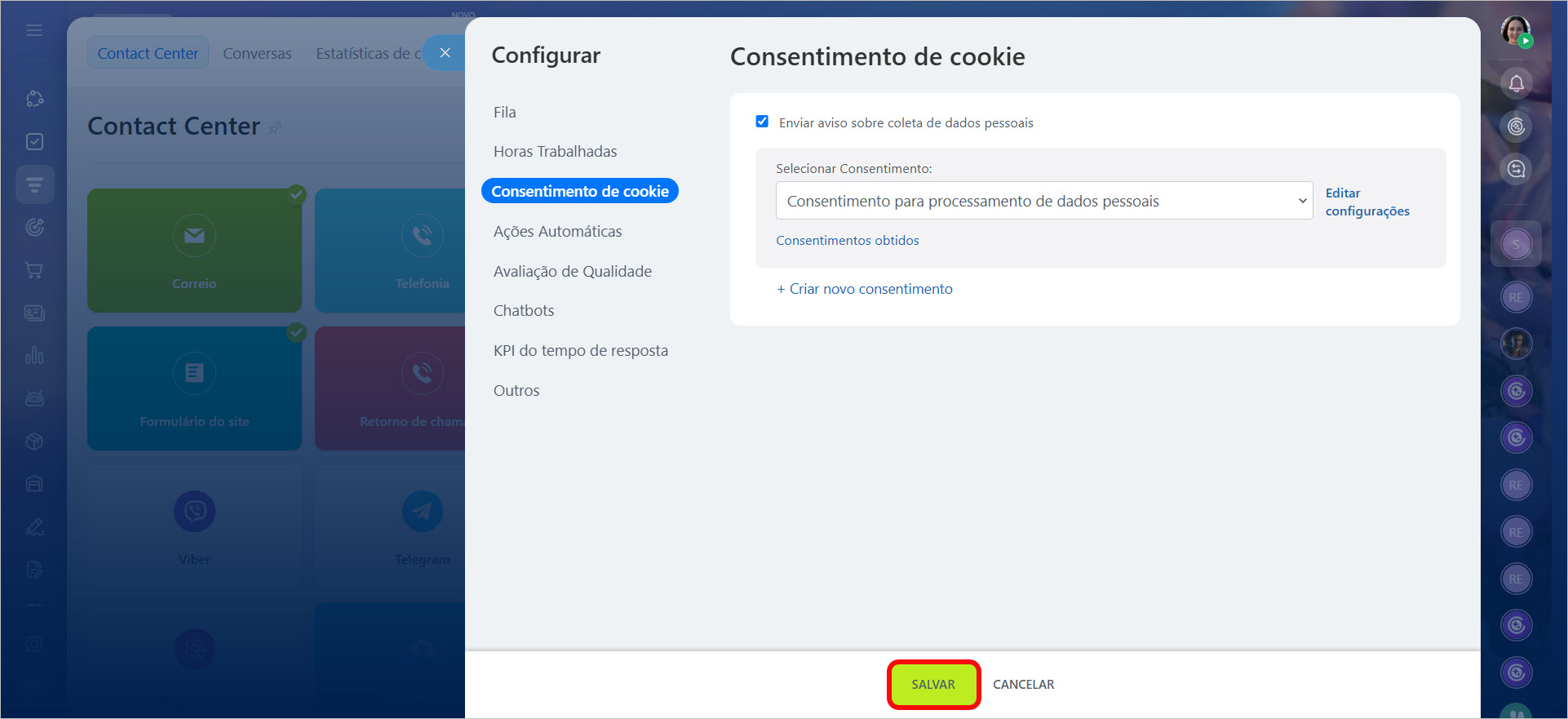 Em muitos países, as empresas são legalmente obrigadas a obter o consentimento do cliente antes de coletar ou usar dados pessoais. No Bitrix24, você pode solicitar automaticamente esse consentimento ao se comunicar por meio de Canais Abertos, como bate-papo ao vivo ou mensageiros.