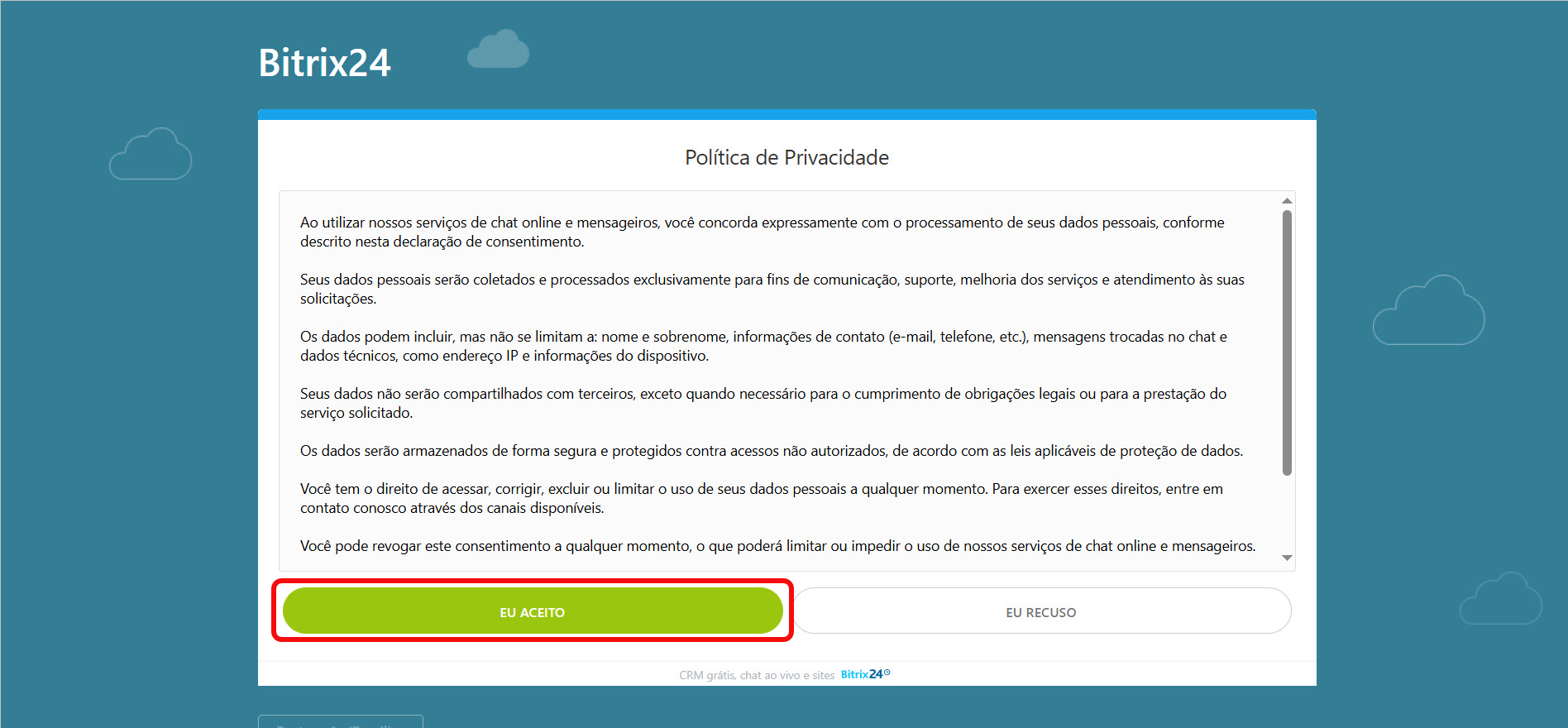 - Eu aceito. O Bitrix24 inicia uma nova conversa e o consentimento do cliente para o processamento de dados pessoais é salvo no CRM.