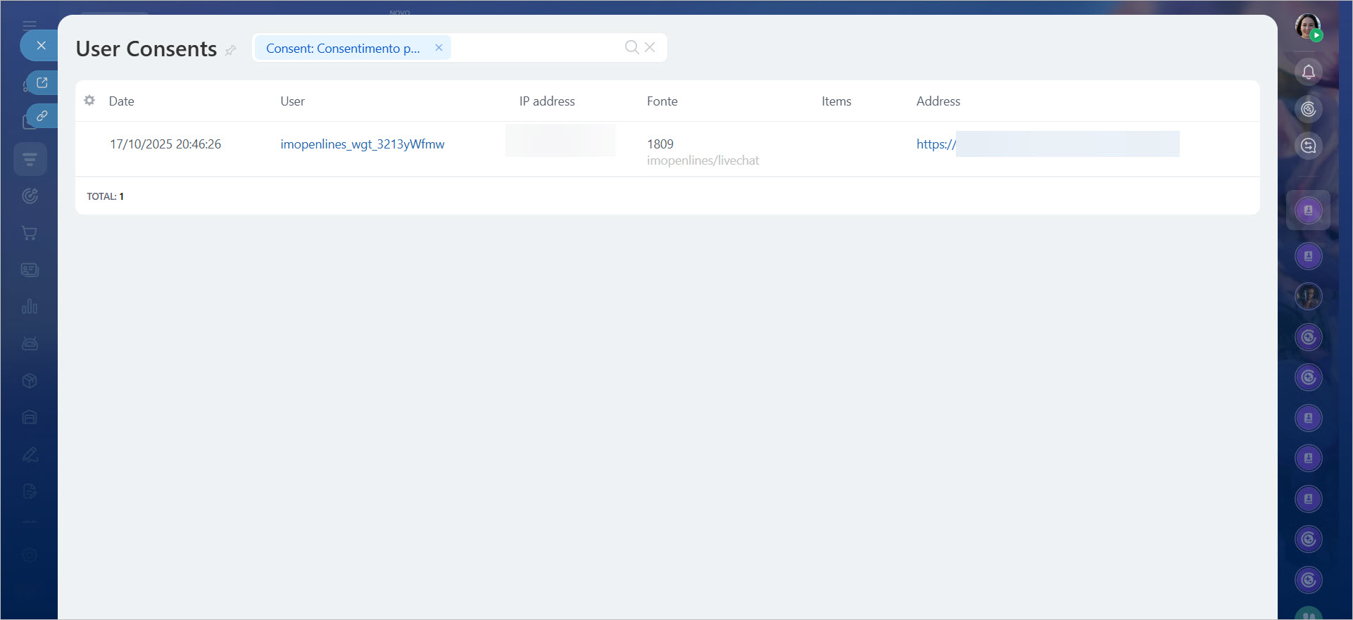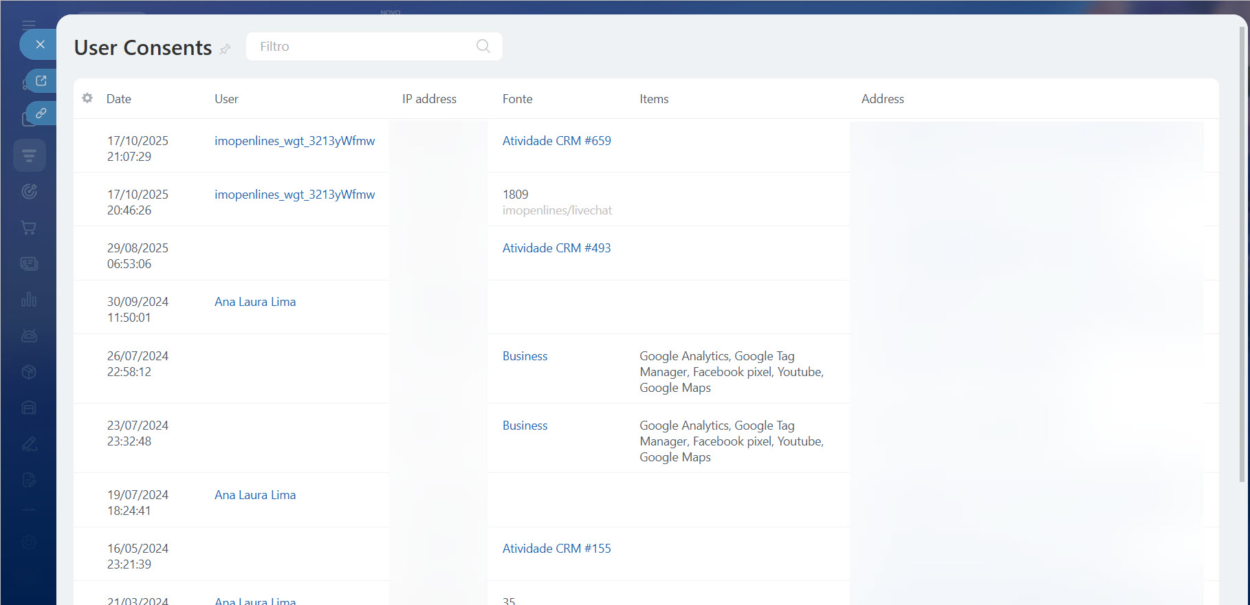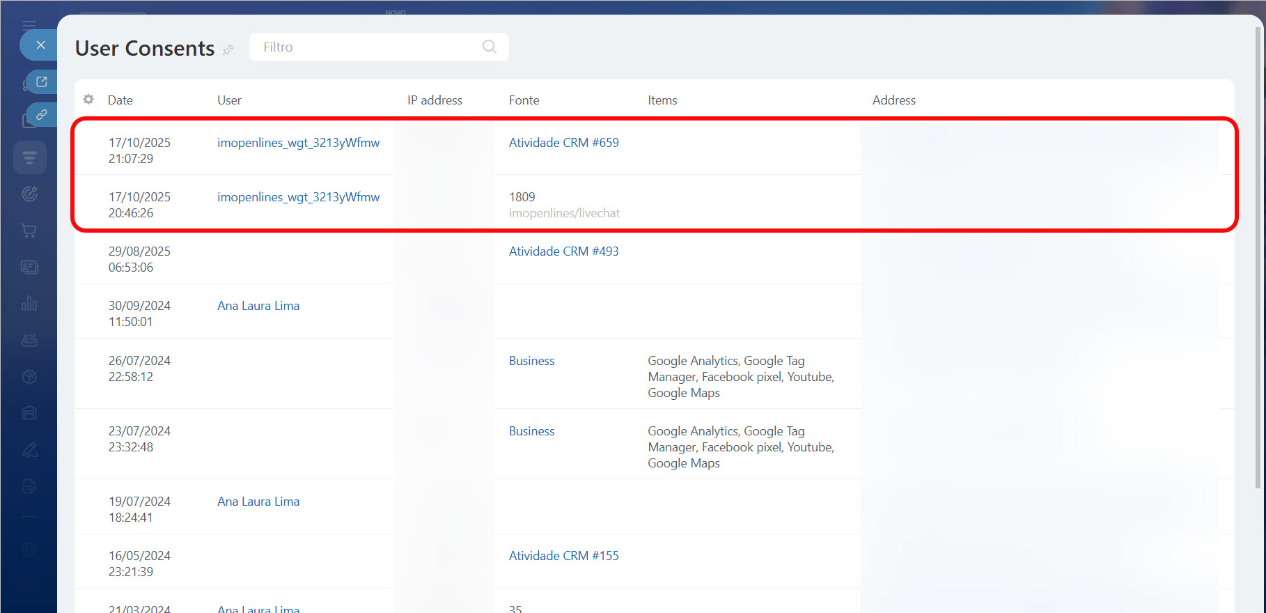 A lista incluirá dois registros de consentimento para o cliente. O primeiro mostrará a URL da página onde o cliente confirmou o consentimento na coluna Endereço, e o segundo estará vinculado à conversa no Bitrix24.