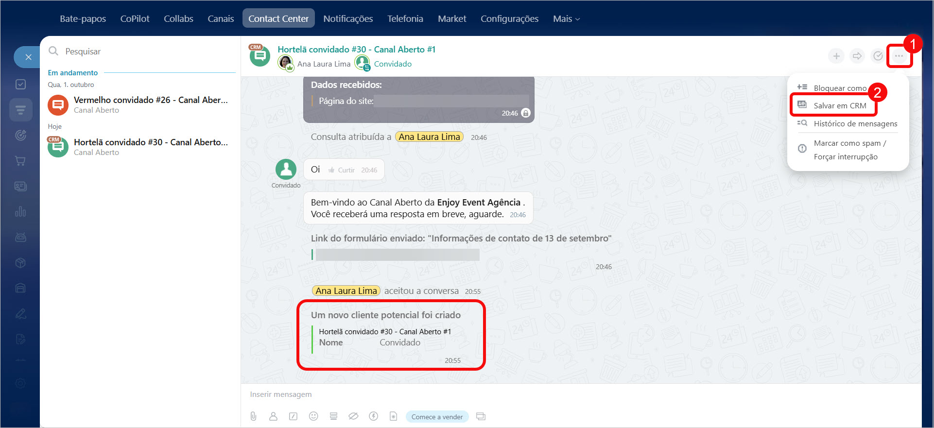 - Para vincular o consentimento de um novo cliente do bate-papo ao vivo a um item do CRM, salve os dados do cliente diretamente na janela do chat: abra o menu de três pontos (...) e selecione Salvar no CRM.