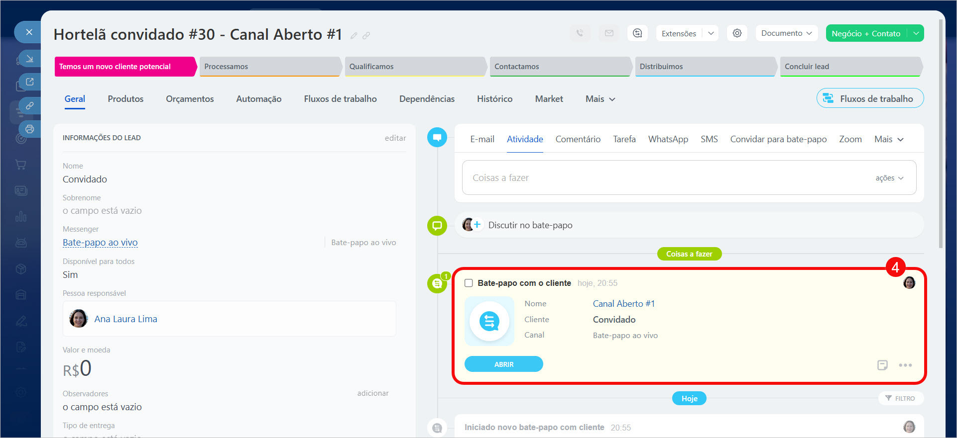 - Usuário. Um perfil de visitante sem acesso ao seu Bitrix24, criado automaticamente para vincular os chats do Canal Aberto ao CRM.