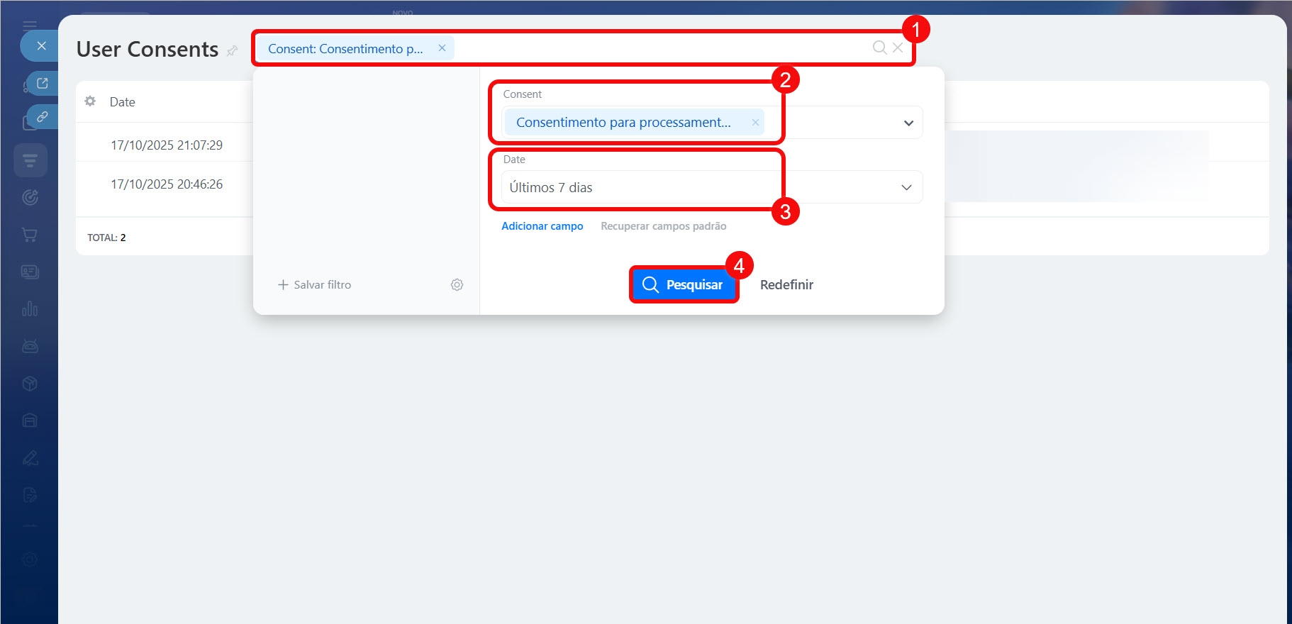 Para localizar registros específicos, use os filtros. Por exemplo, é possível visualizar todos os consentimentos recebidos na última semana.