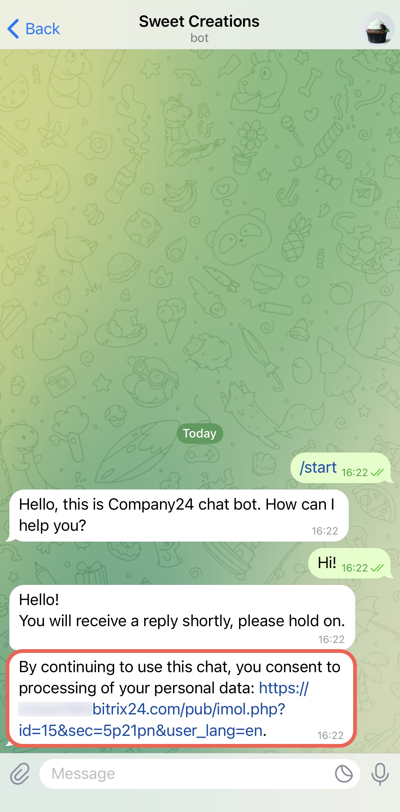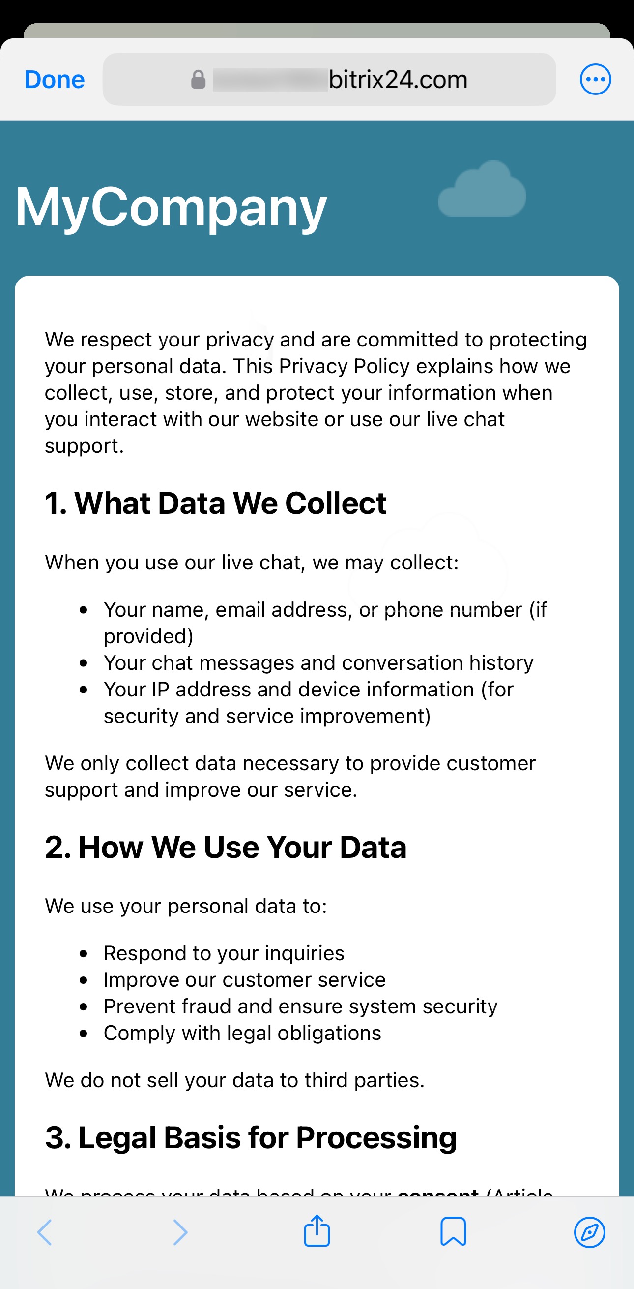 - No Bitrix24, você pode solicitar automaticamente o consentimento para o processamento de dados por meio da comunicação em Canais Abertos, como bate-papo ao vivo ou mensageiros.