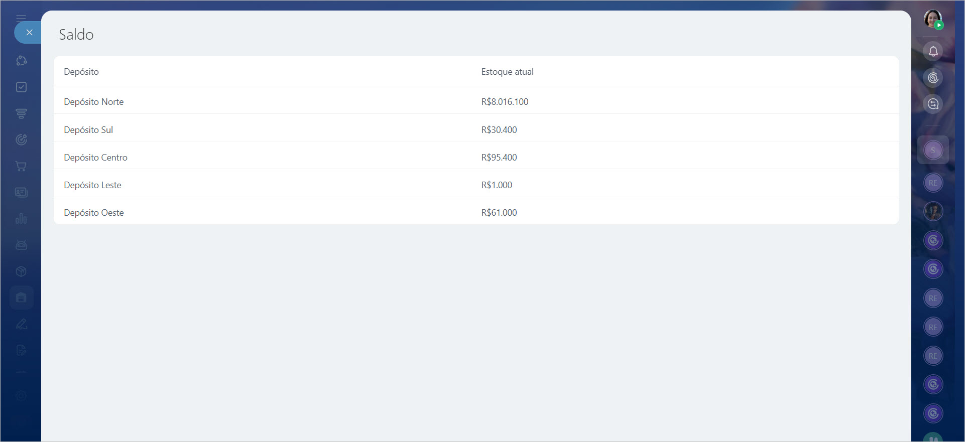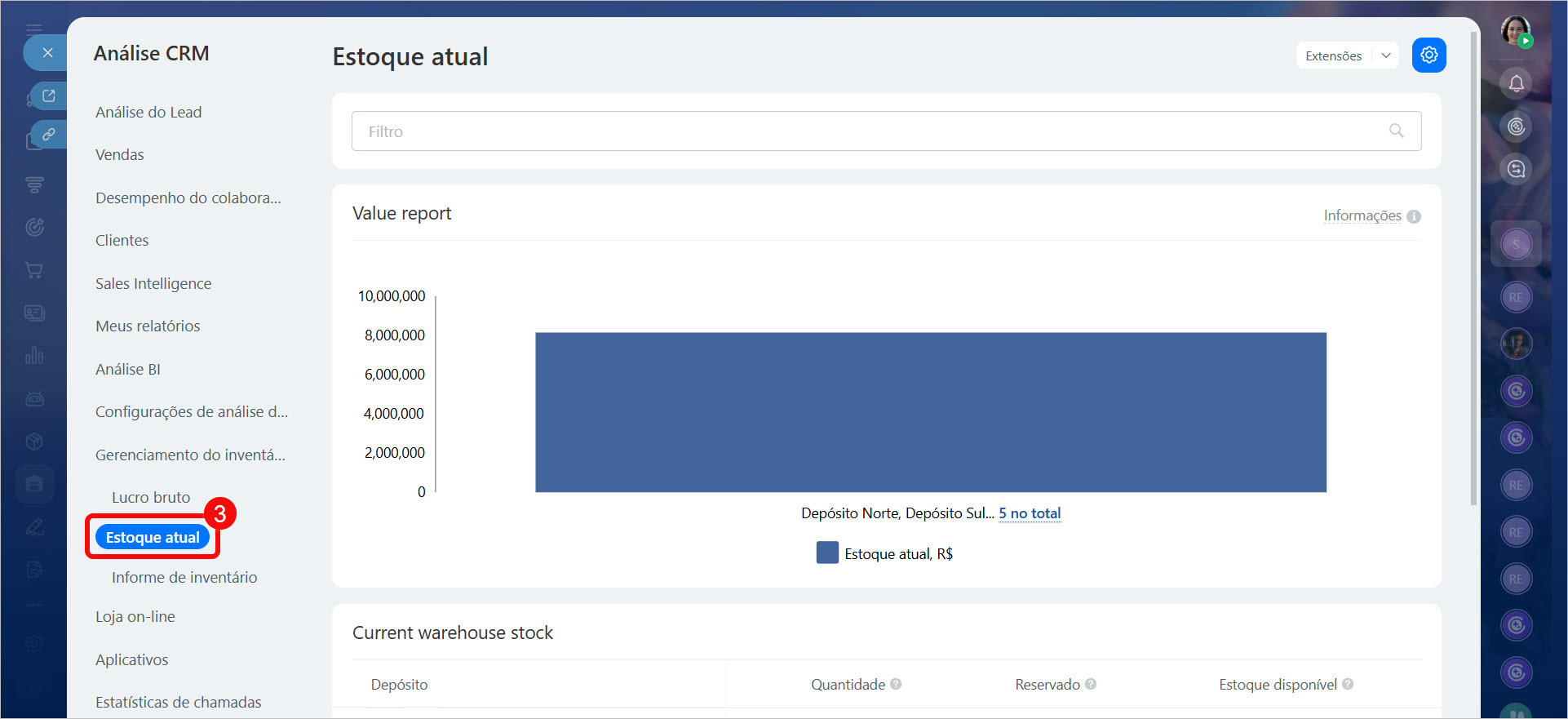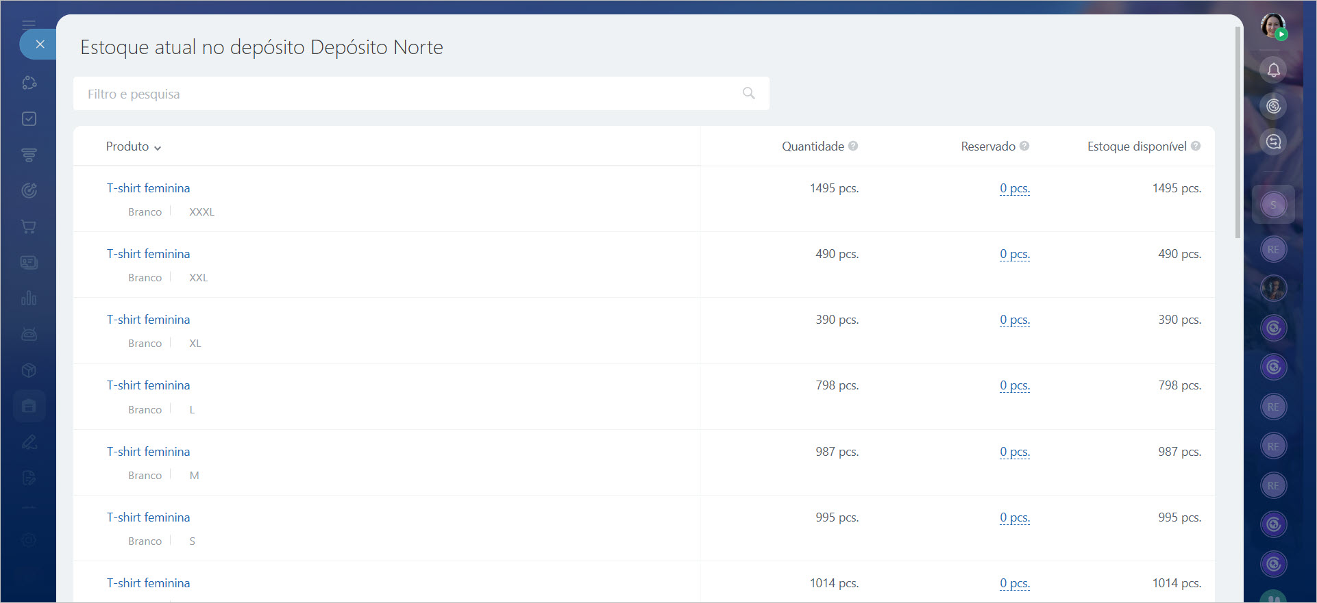O relatório mostra a quantidade de produtos em cada depósito, quantos já estão reservados em negócios e o volume disponível para venda. As informações do relatório ajudam a identificar déficits, planejar compras e decidir quando transferir produtos entre os depósitos. Por exemplo, um supervisor pode perceber que os produtos em um depósito estão em falta e solicitar um novo lote.