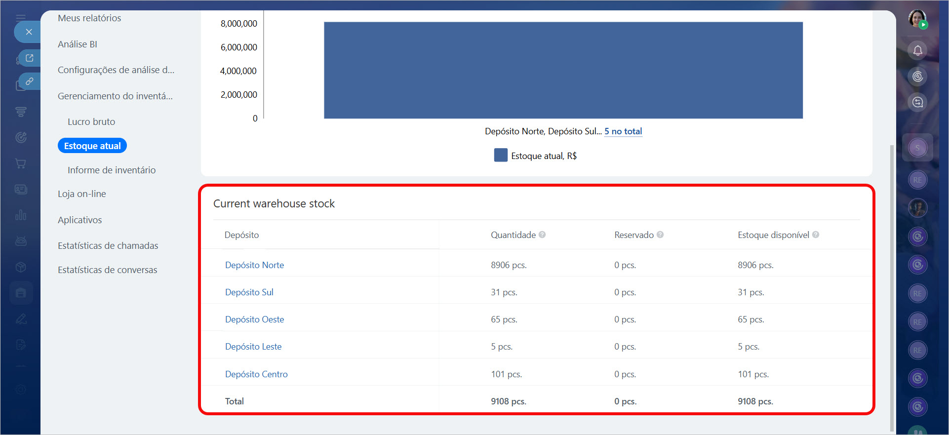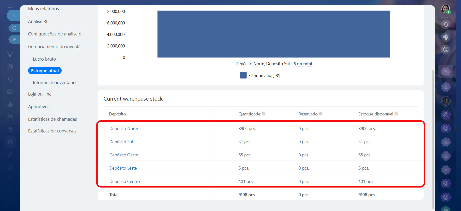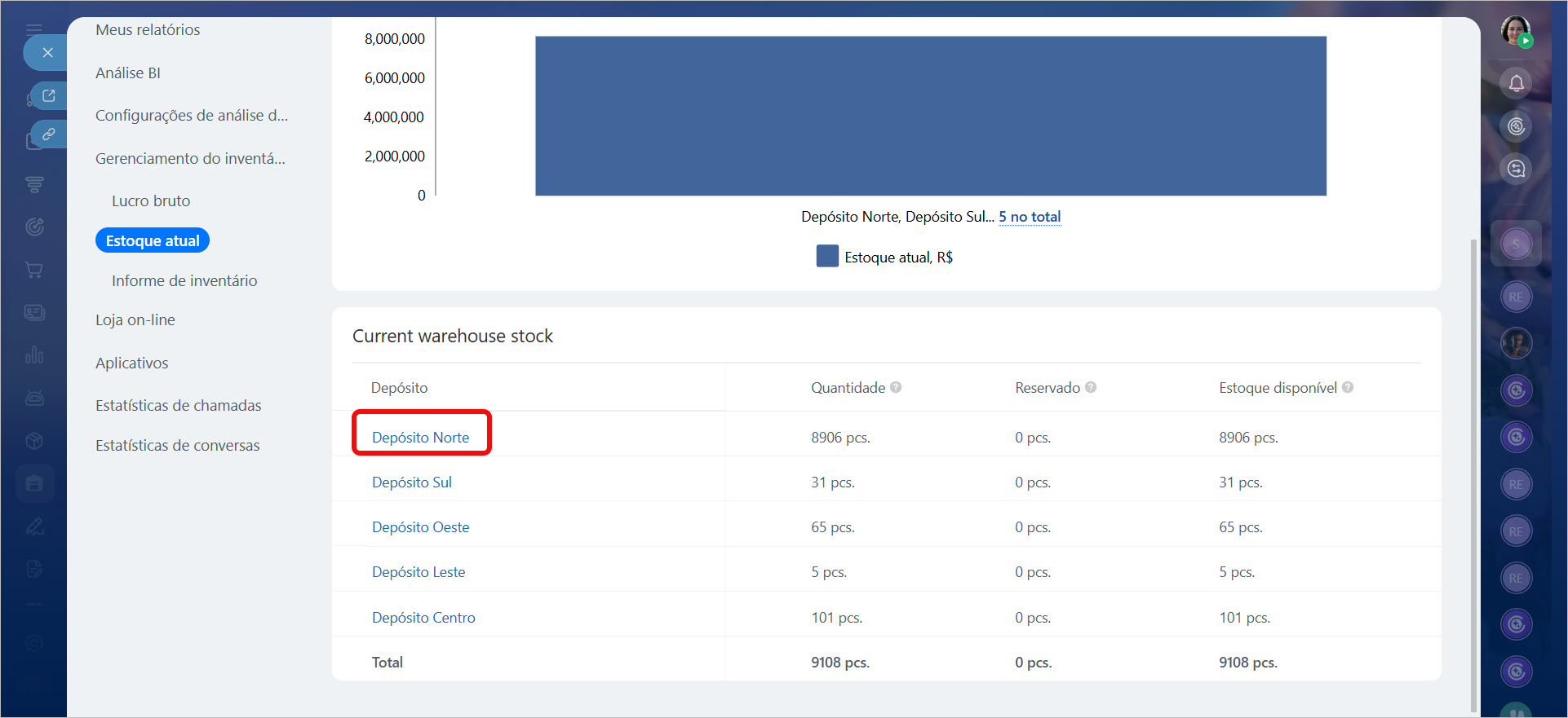 Na parte superior do relatório, é exibido o valor total dos estoques em todos os depósitos. O valor é calculado com base nos preços de compra. Para visualizar os dados de cada depósito, clique no gráfico.