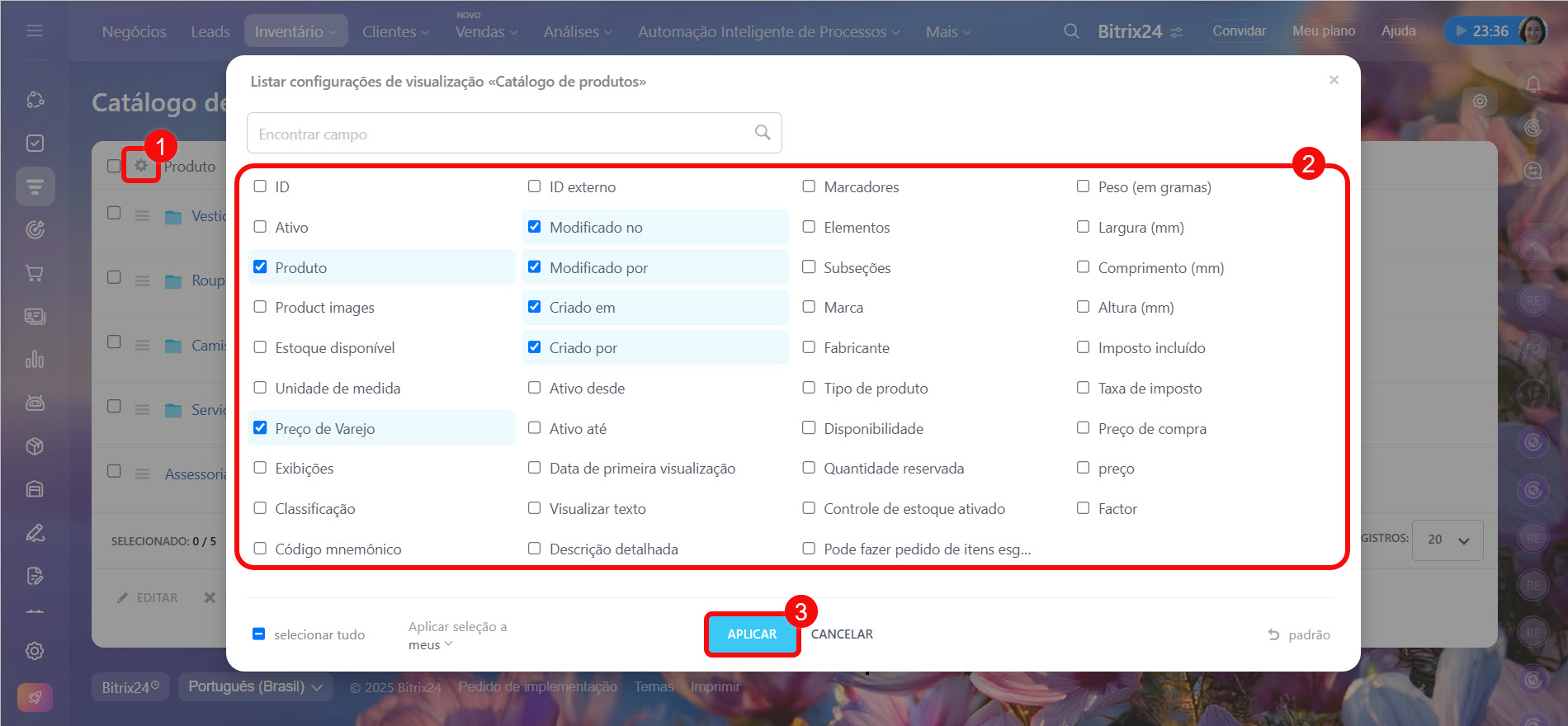 2–4. Selecione os campos que serão exibidos na lista — acesse as configurações da lista, marque as propriedades desejadas e clique em Aplicar.