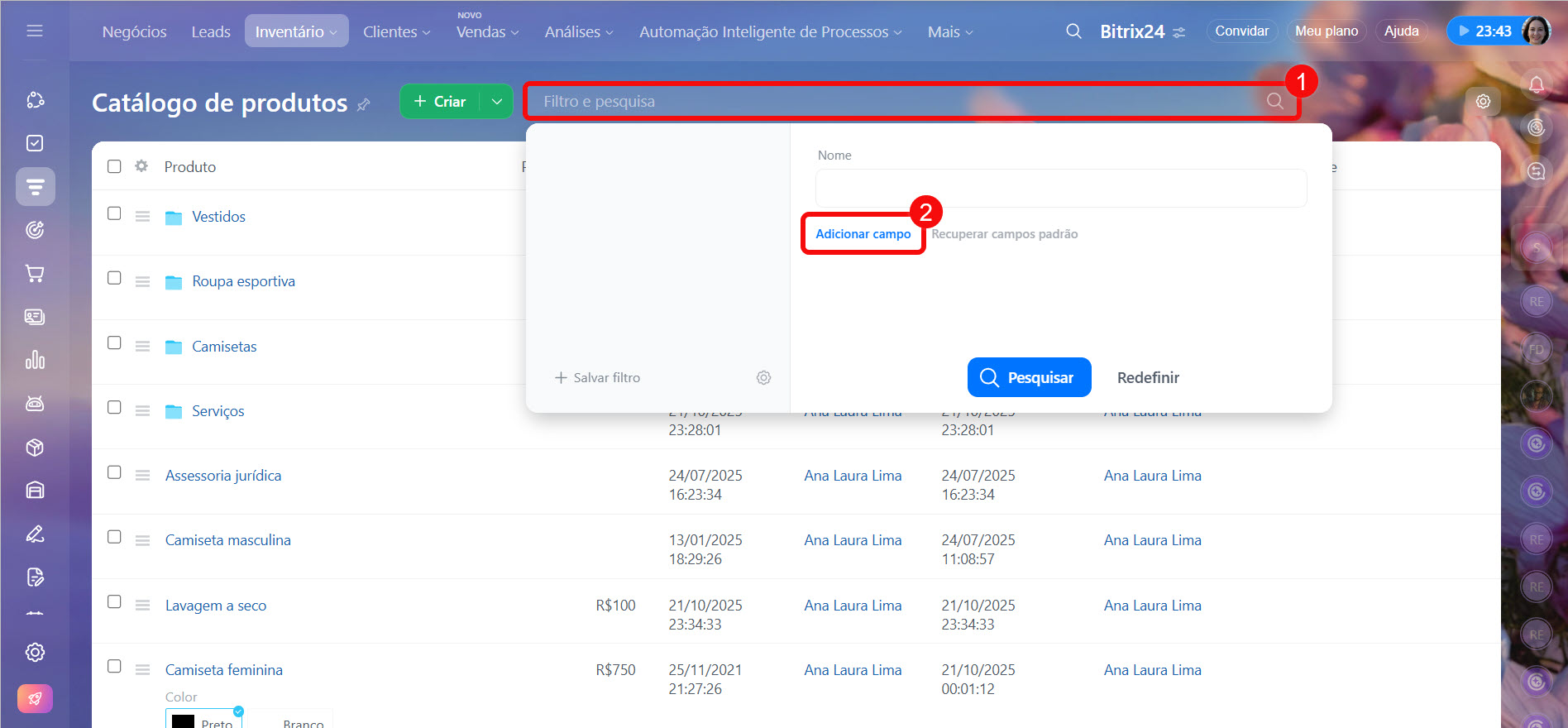 Acesse CRM > Inventário > Catálogo de produtos.