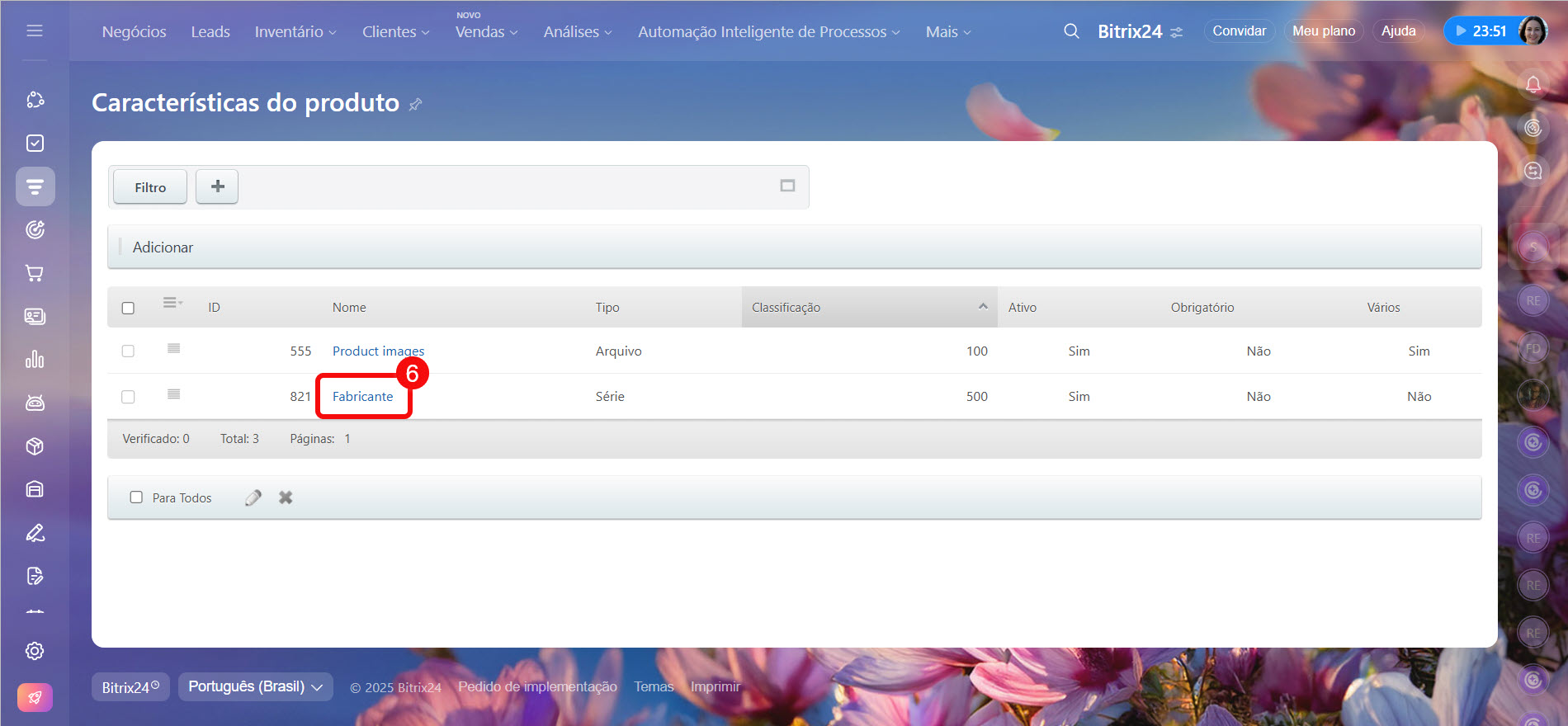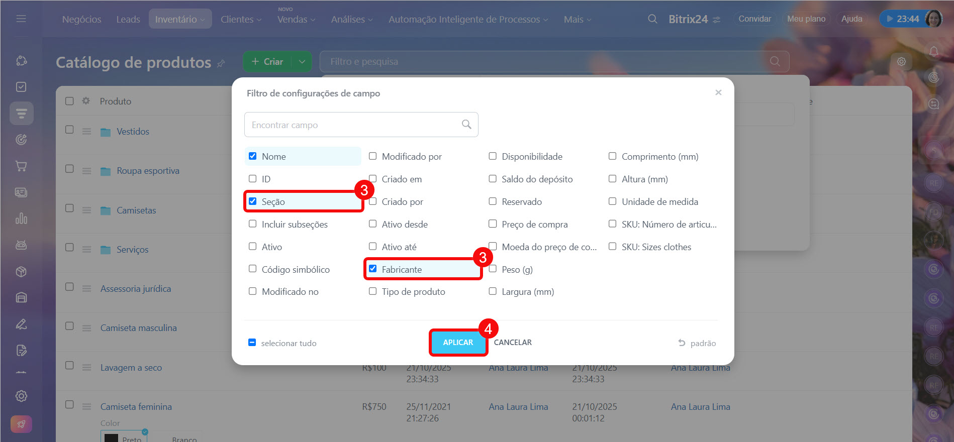 Se o campo necessário não estiver na lista, adicione-o nas configurações de propriedades dos produtos. Isso pode ser feito pelo administrador do Bitrix24 ou do CRM.
