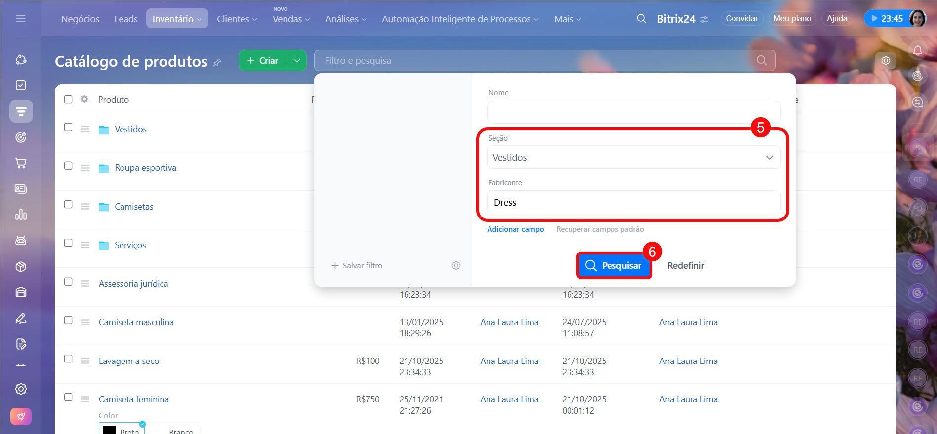 - No catálogo, é possível buscar produtos e serviços usando a barrа de pesquisa e filtros. Clique em Filtro e pesquisa e insira os parâmetros desejados, como nome ou fabricante.