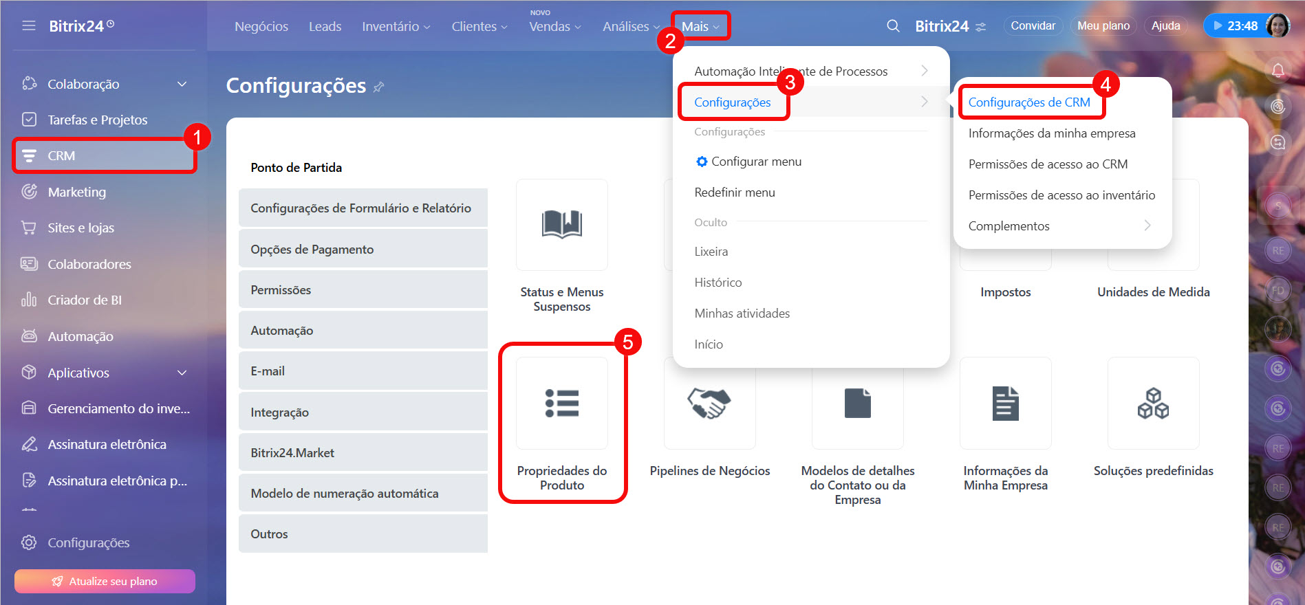 1–5. Acesse CRM > Mais > Configurações > Configurações de CRM > Propriedades do produto.