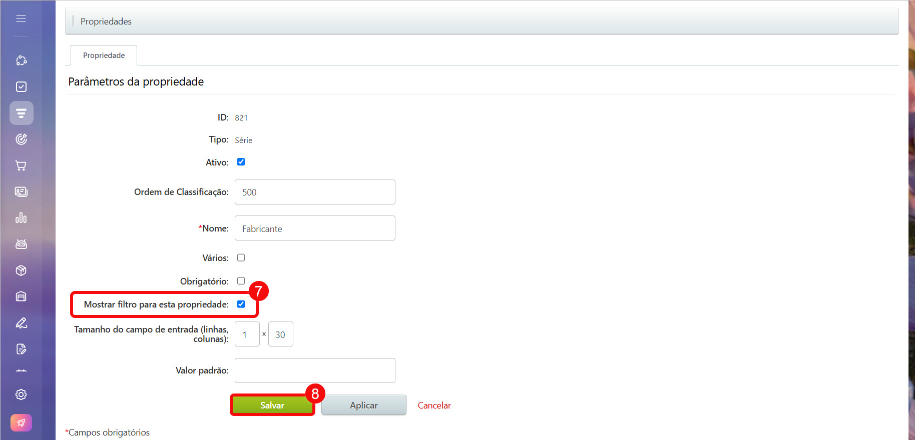 7–8. Marque a opção Mostrar filtro para esta propriedade. Salve as alterações.
