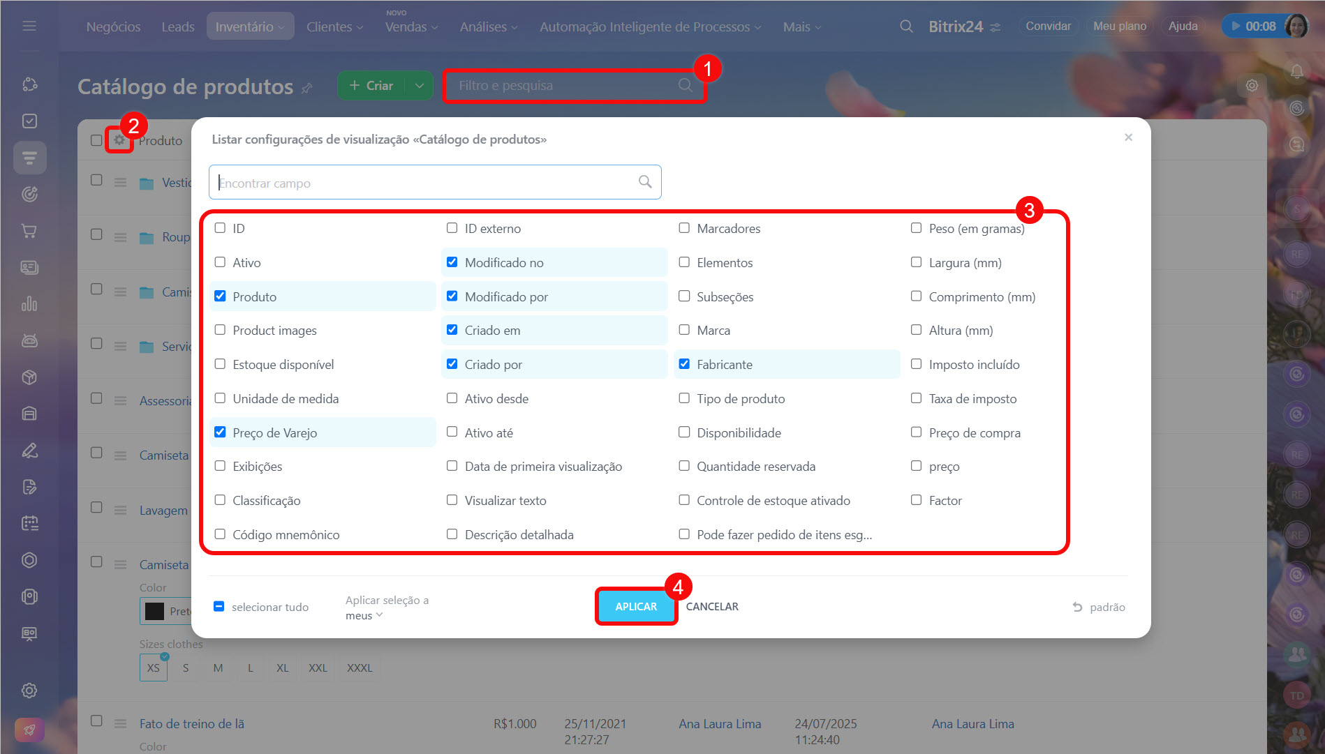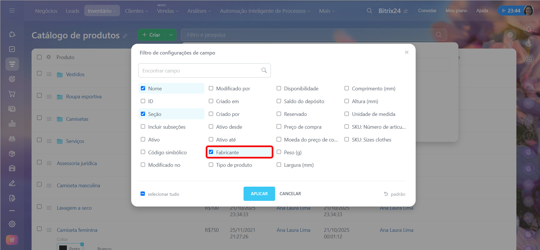 Personalize a lista de produtos e serviços de acordo com suas necessidades para visualizar apenas os parâmetros relevantes. Clique em Configurações (⚙️), marque as colunas que deseja exibir na lista e clique em Aplicar. Por exemplo, é possível exibir o código, o estoque disponível e o fabricante, caso seja importante comparar rapidamente as características.