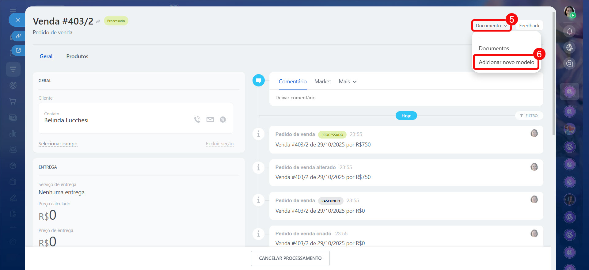 1-2. Abra a negociação correspondente no CRM e crie um pedido de venda para a transferência.