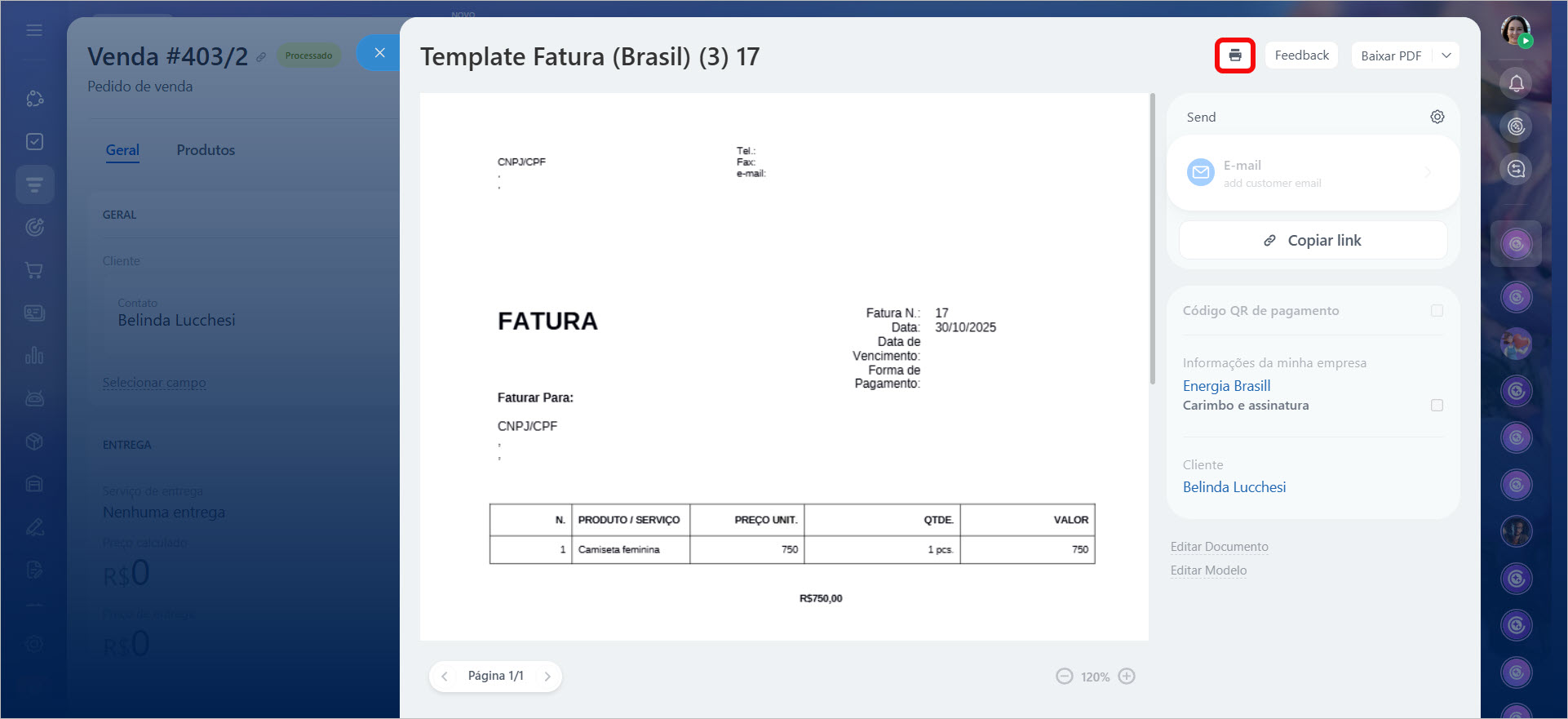 A partir do modelo carregado, você pode criar o documento, onde todos os dados são salvos automaticamente. O documento pode ser impresso ou enviado por e-mail.