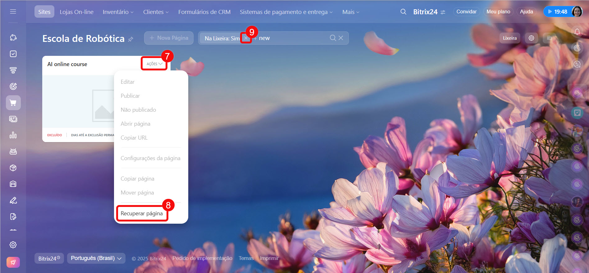 9. Limpe o filtro — clique no "x" ao lado da condição Na lixeira: Sim. Assim, você retornará à lista completa de páginas do site.
