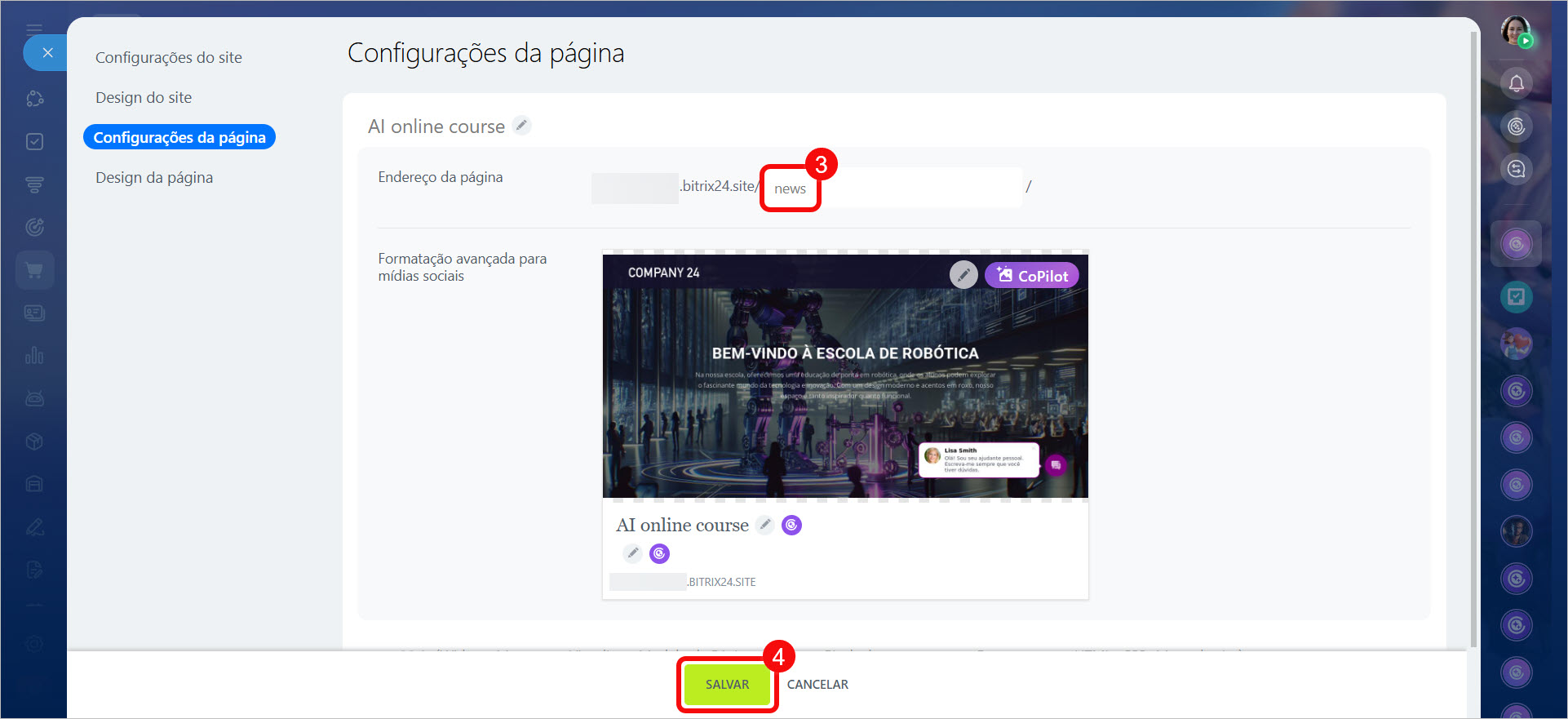 O endereço do site no Bitrix24 é gerado automaticamente e consiste em:
