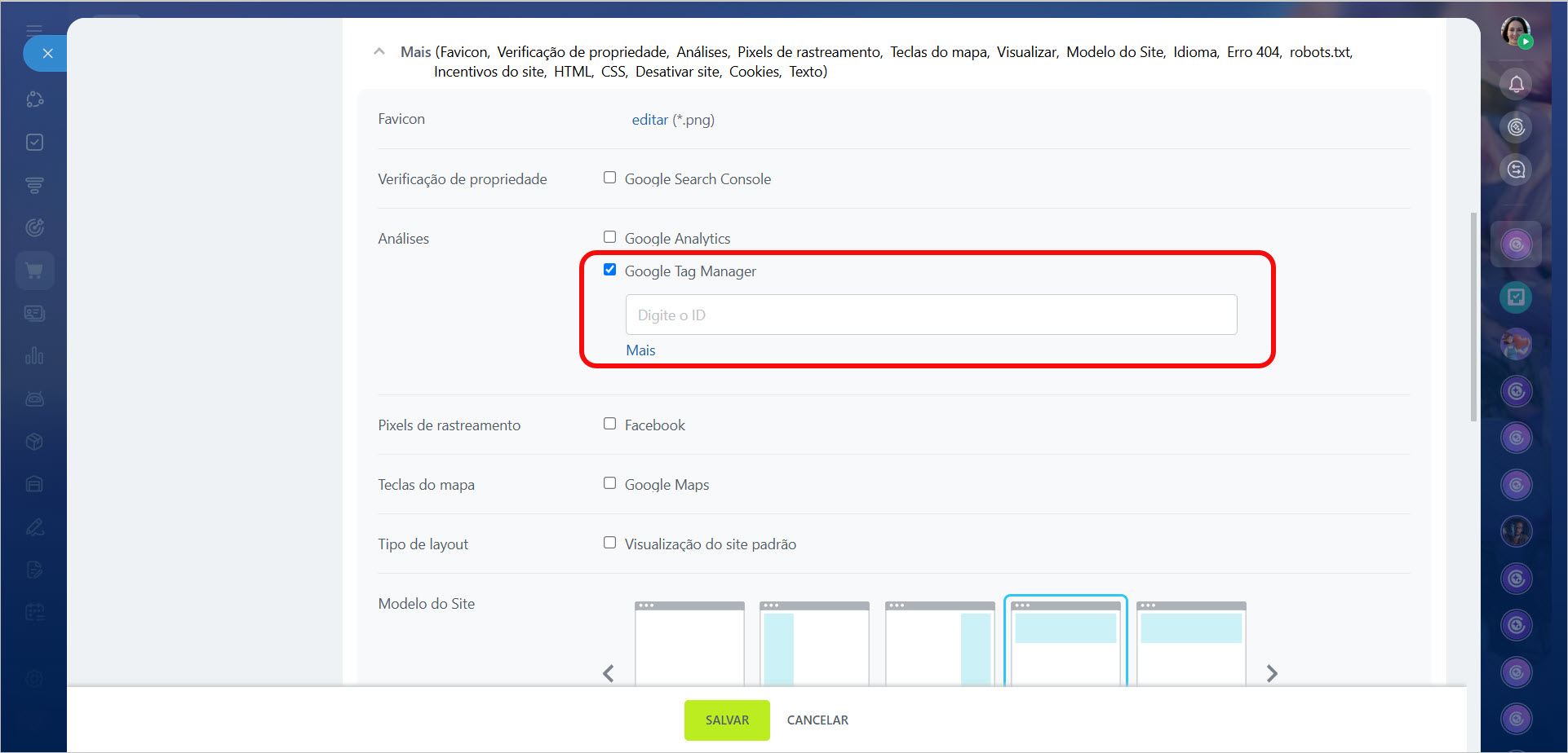 Você pode melhorar a visibilidade do site nos mecanismos de busca utilizando meta tagsElementos no código HTML que transmitem informações sobre o conteúdo da página para mecanismos de busca como Google. Influenciam na posição nos resultados de busca., mapas do site, códigos de análise e outras configurações de SEO. Isso permite aumentar o tráfego, analisar suas origens e otimizar as páginas que geram melhores resultados.