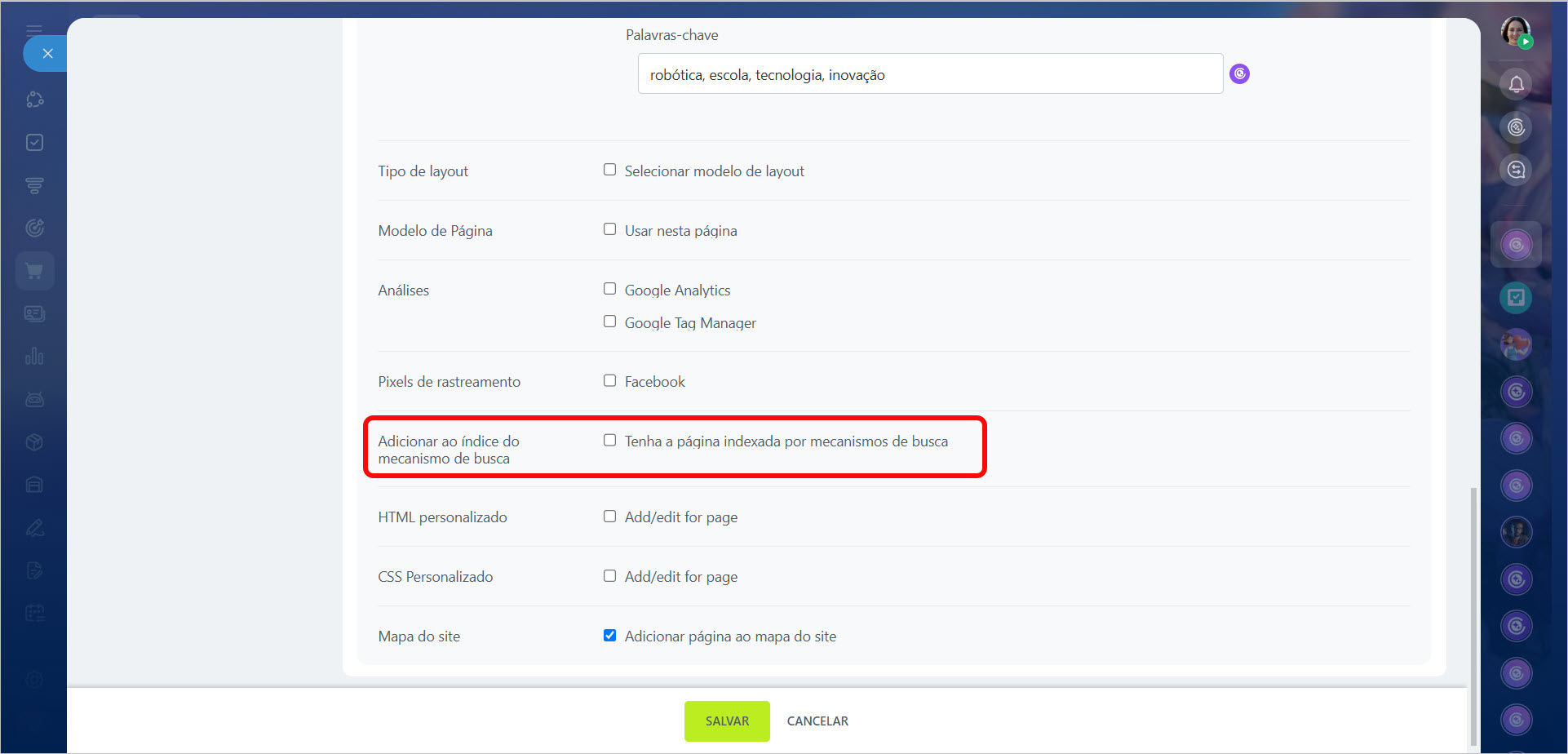 7. Desmarque a opção Tenha a página indexada por mecanismos de busca para ocultar a página dos mecanismos de busca. Para retornar a página aos resultados, marque a opção novamente.
