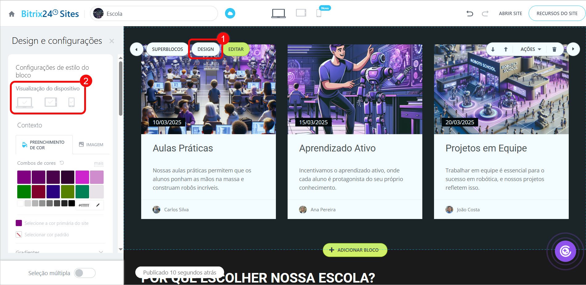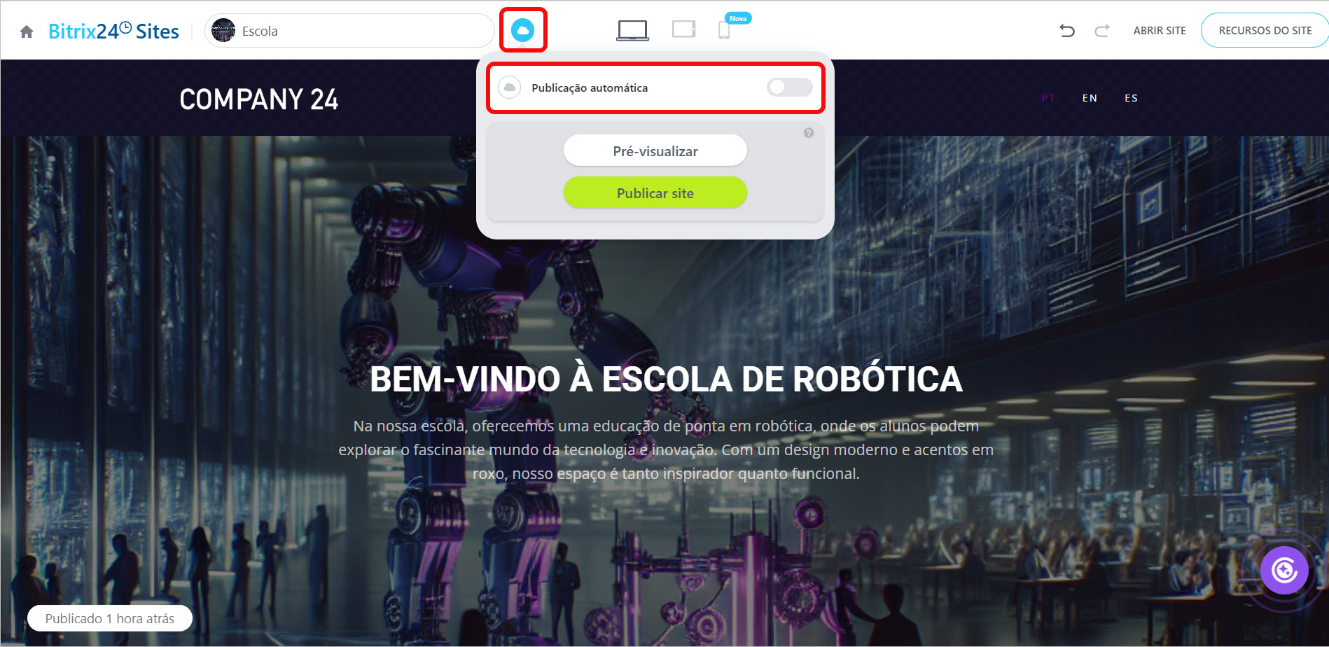 Publicação automática, pré-visualização e navegação nos Bitrix24 Sites