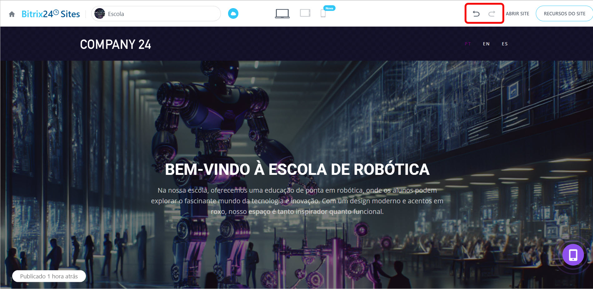 No editor de sites, você pode desfazer uma ação ou restaurar alterações usando os botões