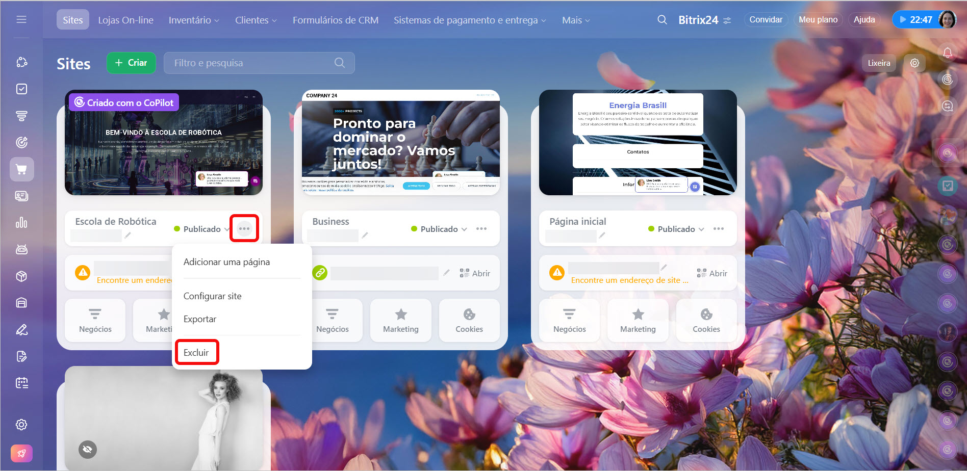 Clique em Três pontos (...) > Excluir. O site será movido para a lixeira e permanecerá lá por 30 dias. Durante esse período, você poderá restaurá-lo; após isso, o site será excluído permanentemente.