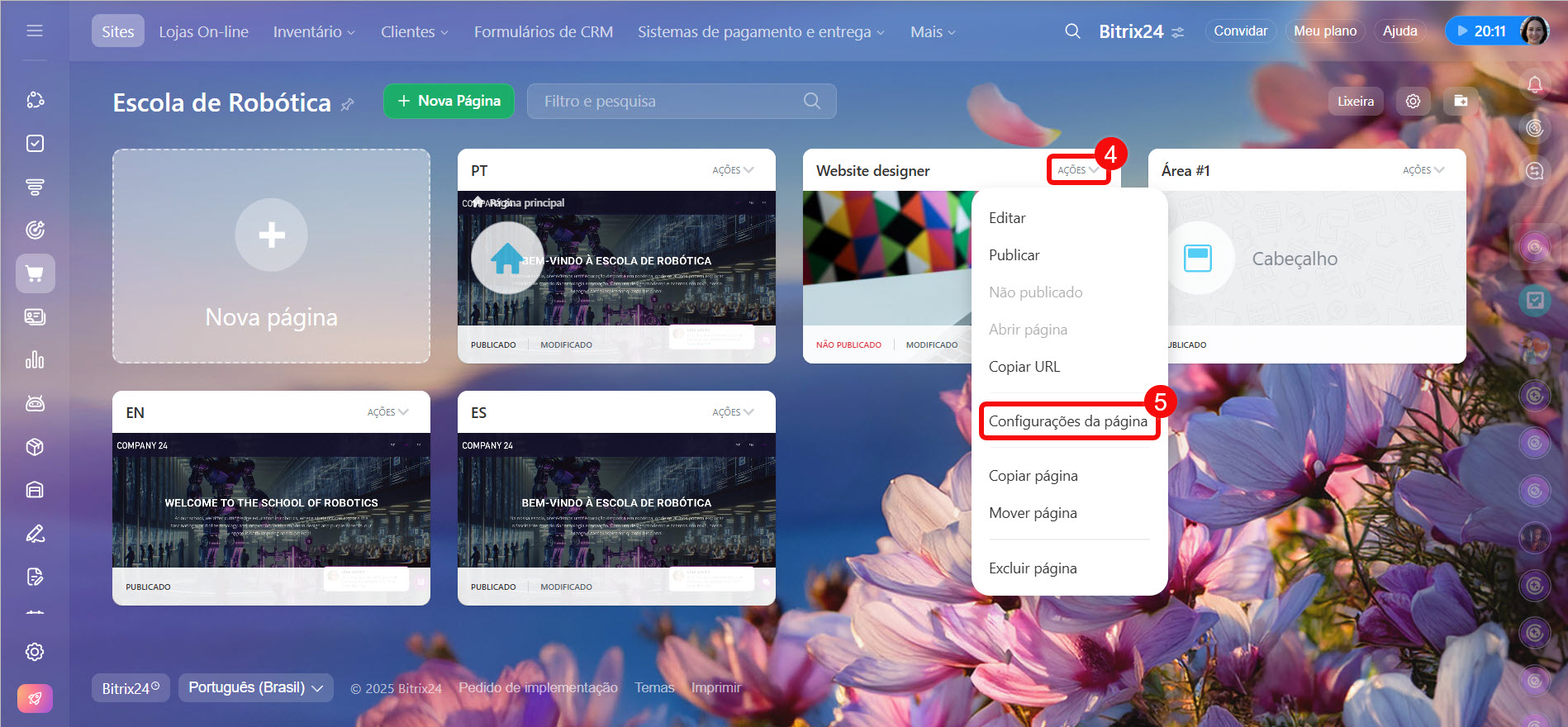 1–2. Localize-a na lista de páginas e clique em Ações > Configurações da página.