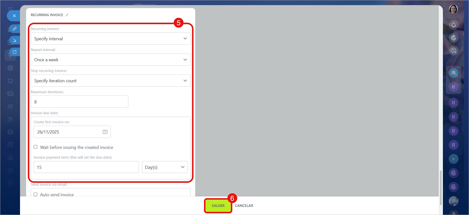 - Especifique o intervalo — o CRM criará faturas automaticamente conforme o cronograma, como semanal ou mensalmente.