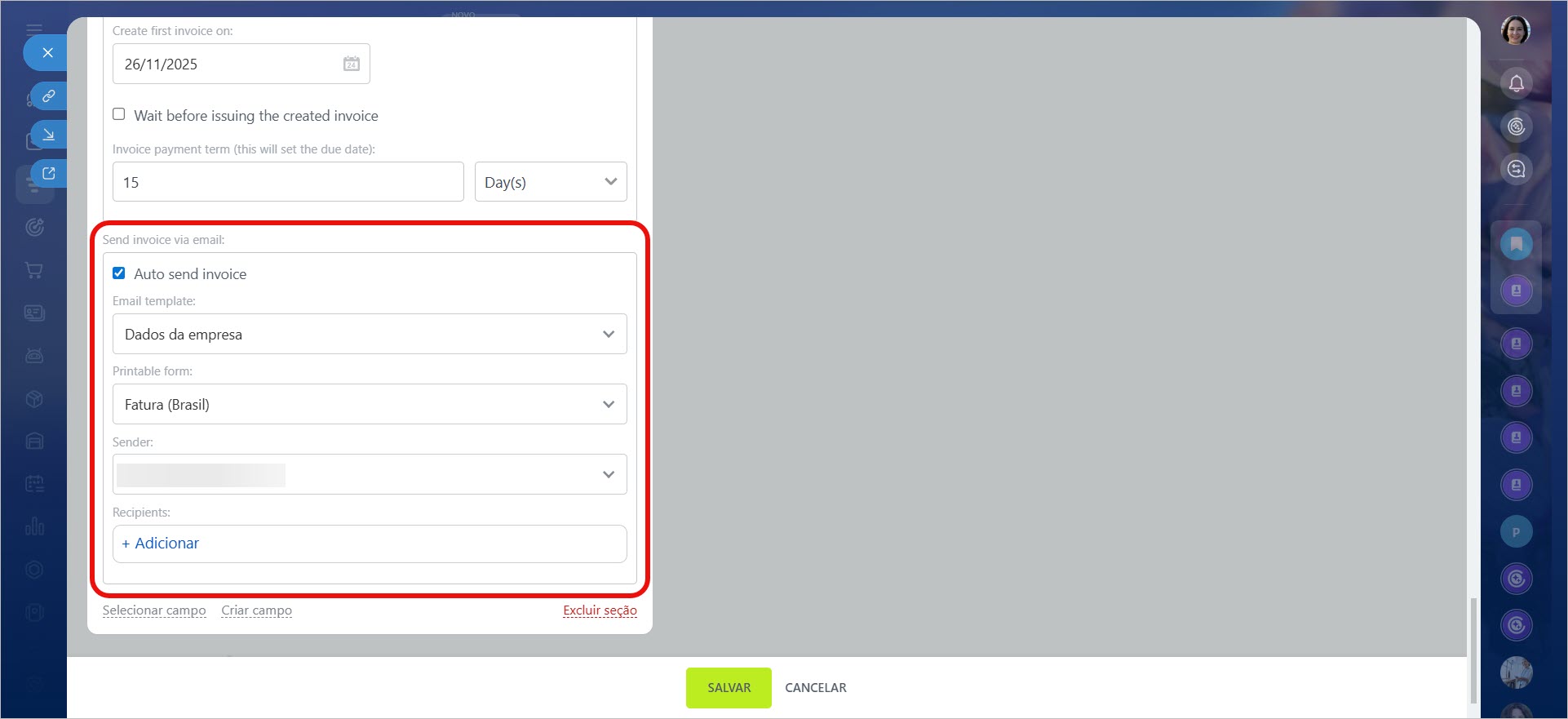 - Para que a fatura recorrente seja enviada automaticamente ao cliente por e-mail, ative a opção Enviar fatura automaticamente.