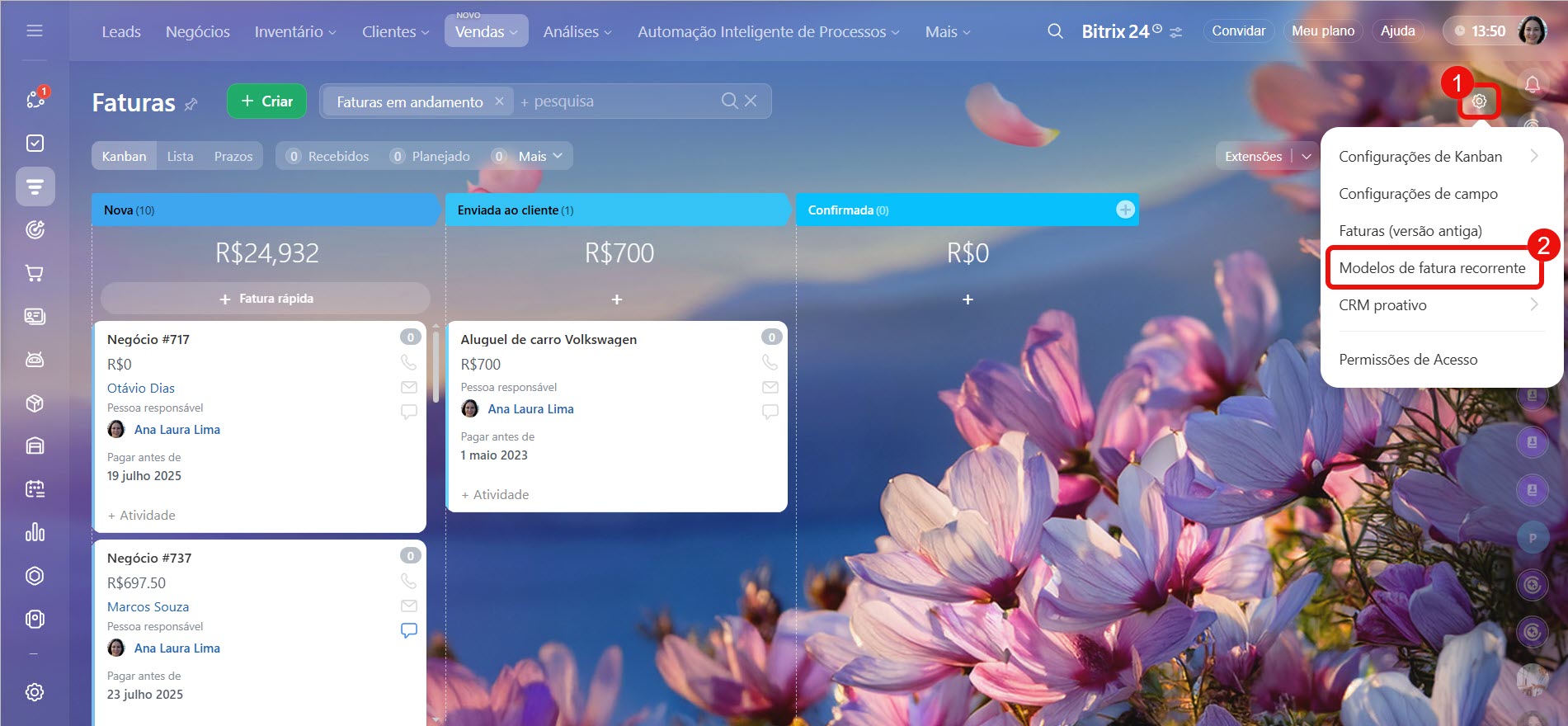 - Após criar uma fatura recorrente, o CRM a salva como um modelo. Para visualizar todas as faturas recorrentes, acesse Configurações (⚙️) > Modelos de Fatura recorrente.