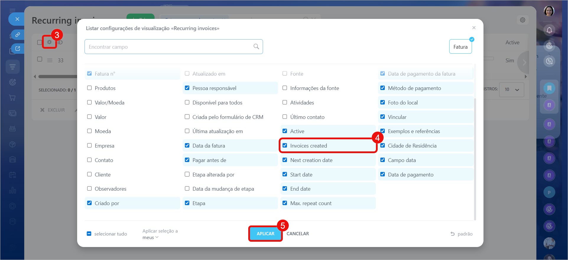 3–4. Se as colunas necessárias não estiverem visíveis, vá em Configurações (⚙️) no canto superior esquerdo da tabela e selecione os campos desejados. Por exemplo, marque o campo Faturas criadas para ver o número total de faturas criadas para cada modelo.