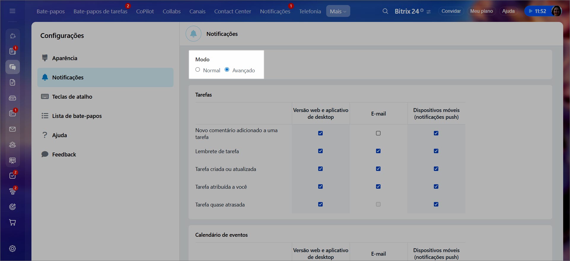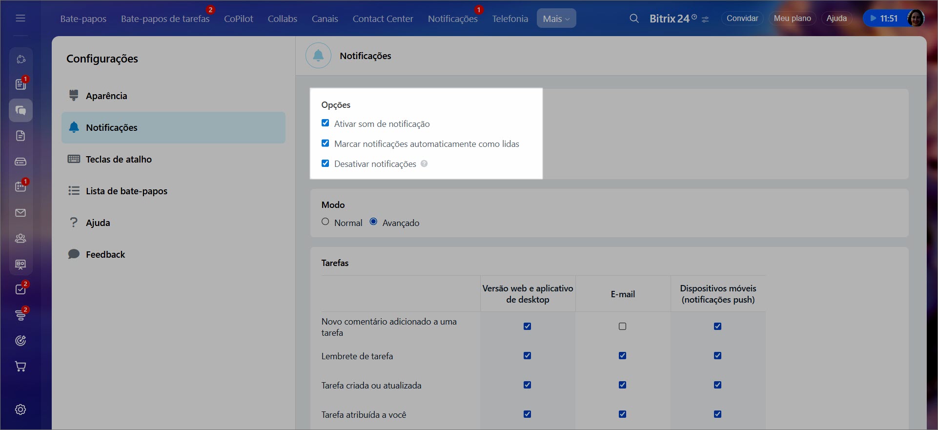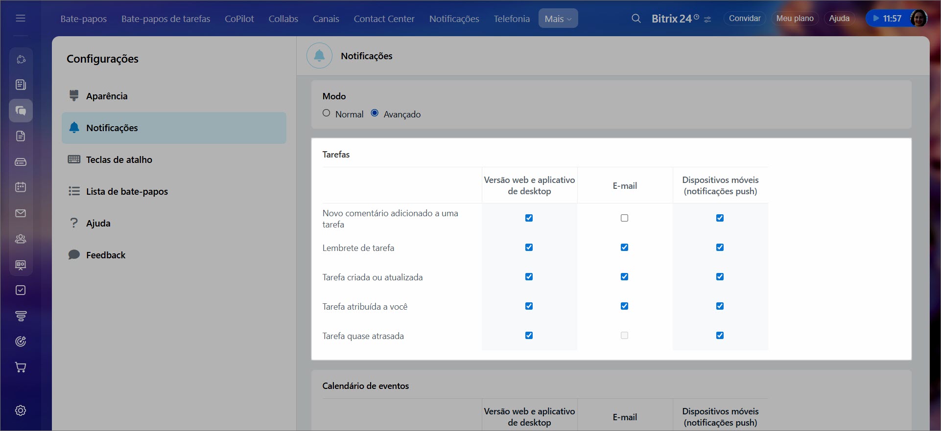 - Avançado — permite configurar notificações separadamente para cada ferramenta do Bitrix24.