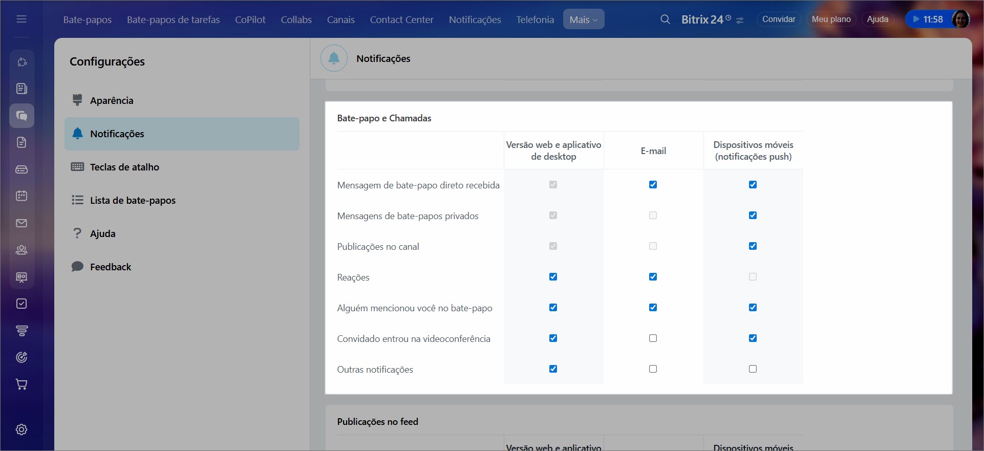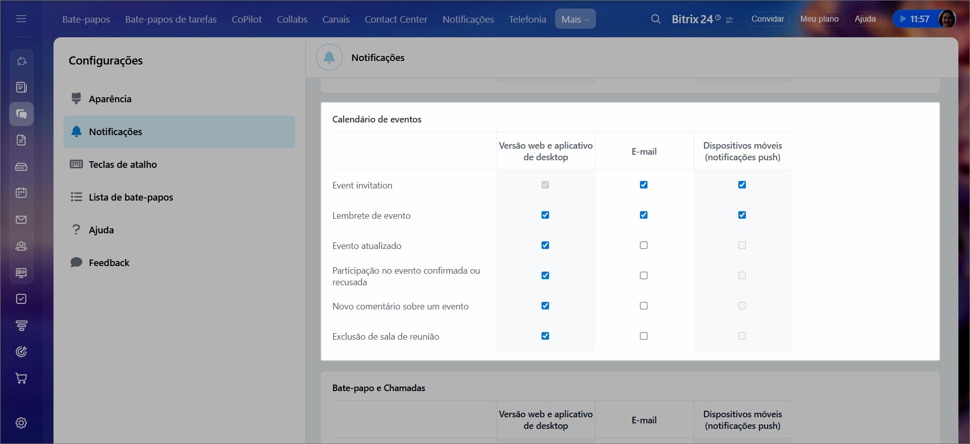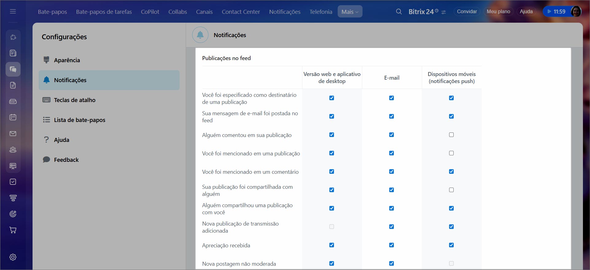 - E-mail — as notificações serão enviadas por e-mail em 5–10 minutos, apenas se não forem lidas no Bitrix24.