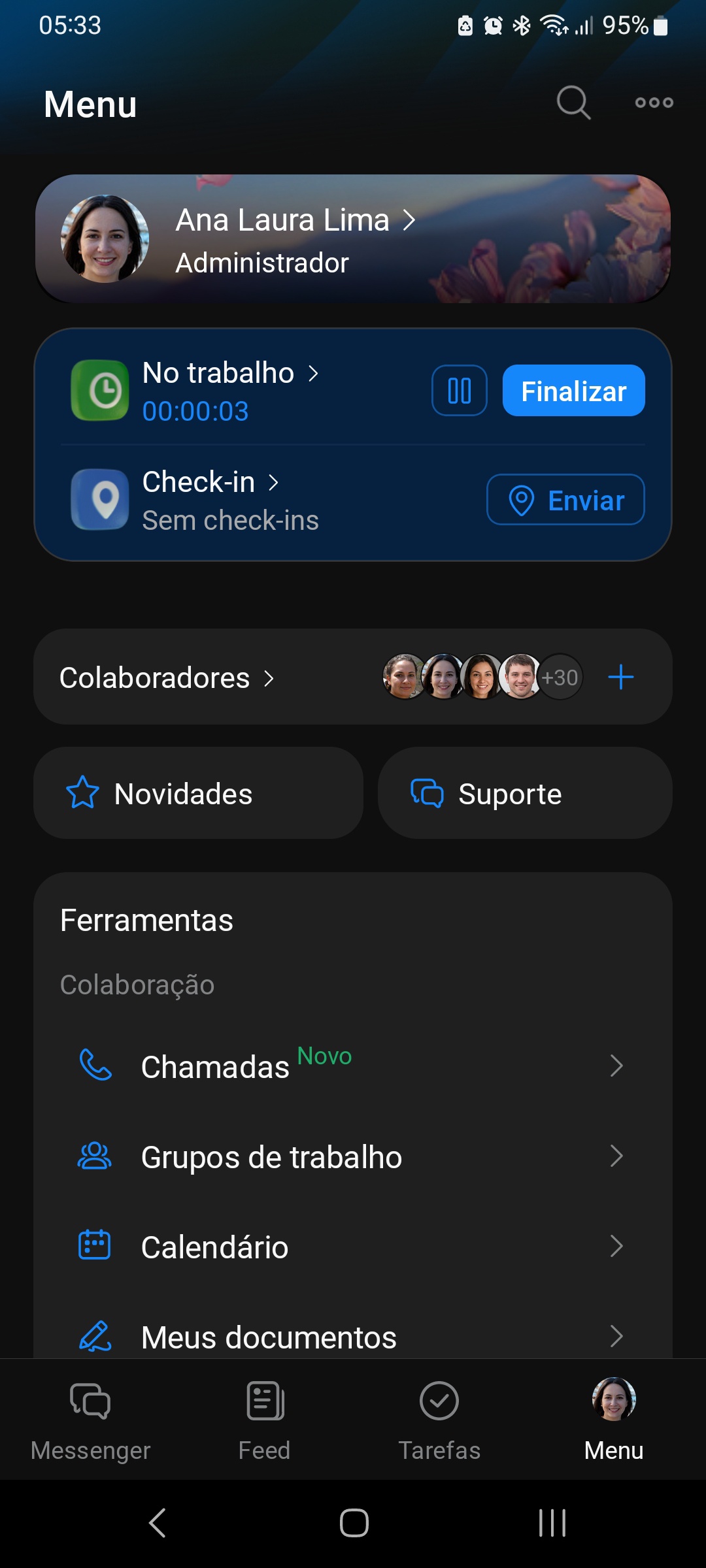 Todas as ferramentas adicionais estão agora em um menu que é aberto ao tocar no seu avatar na parte inferior da tela. Daqui você pode gerenciar seu tempo de trabalho, registrar sua entrada, acessar seu perfil, documentos e ajustes, e trocar rapidamente entre contas.