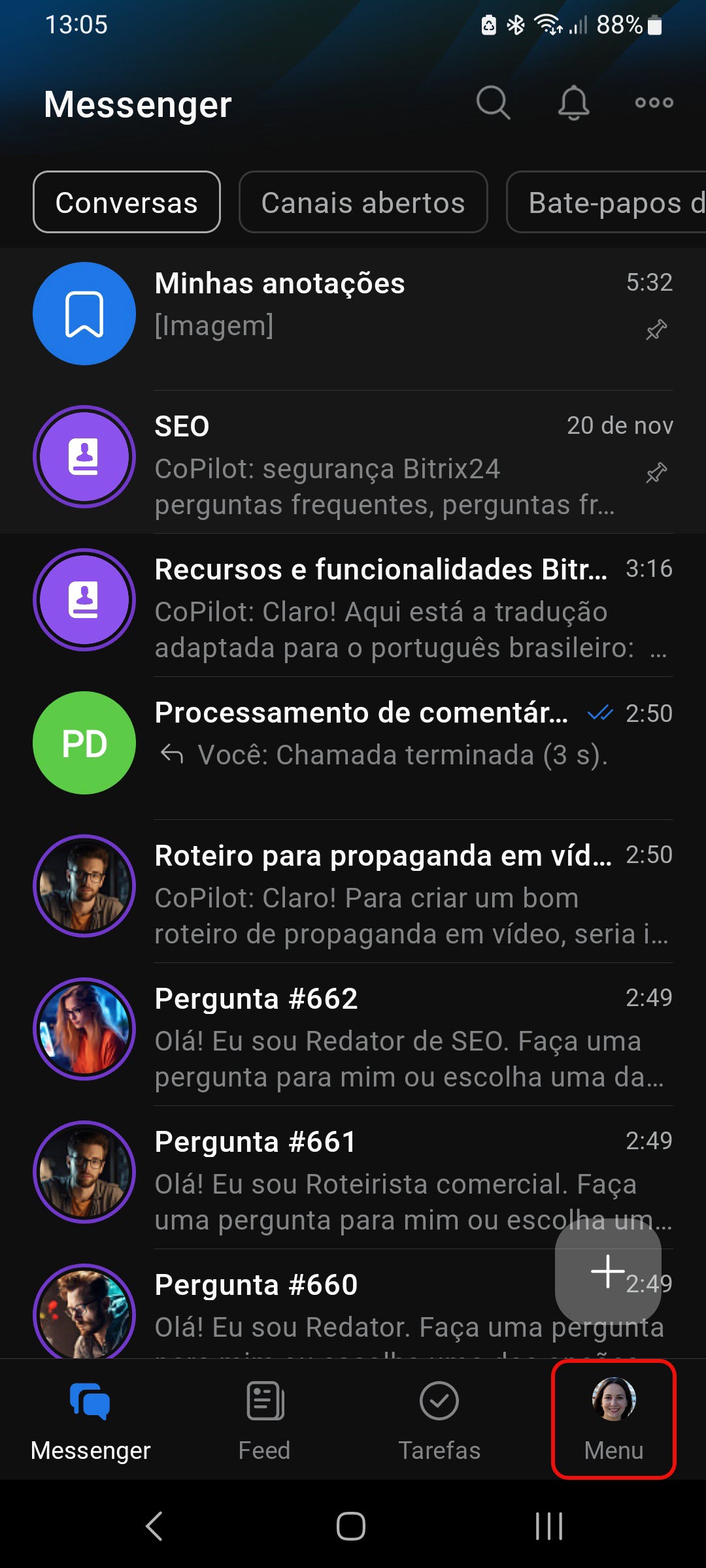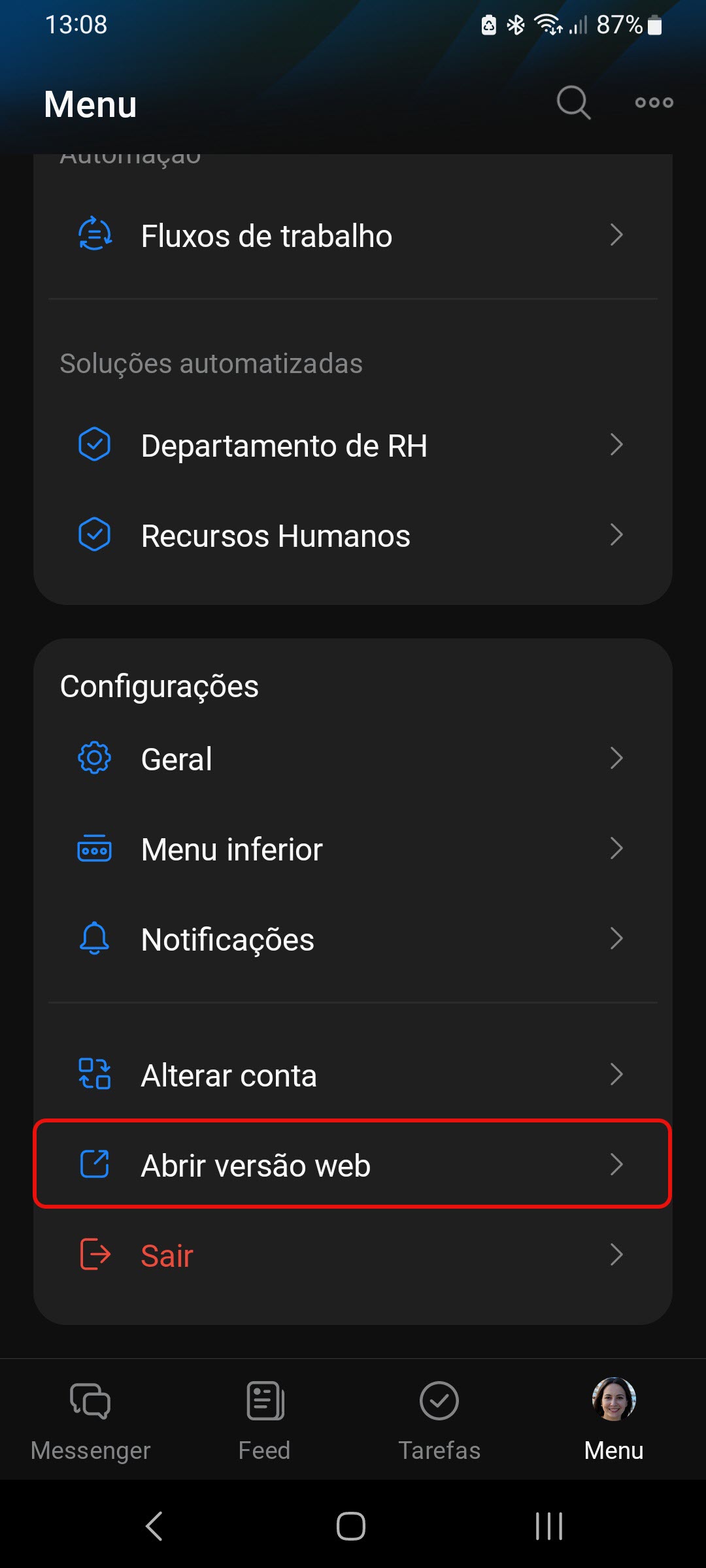 - Sair do Bitrix24 tocando em Três pontos (...) > Sair.