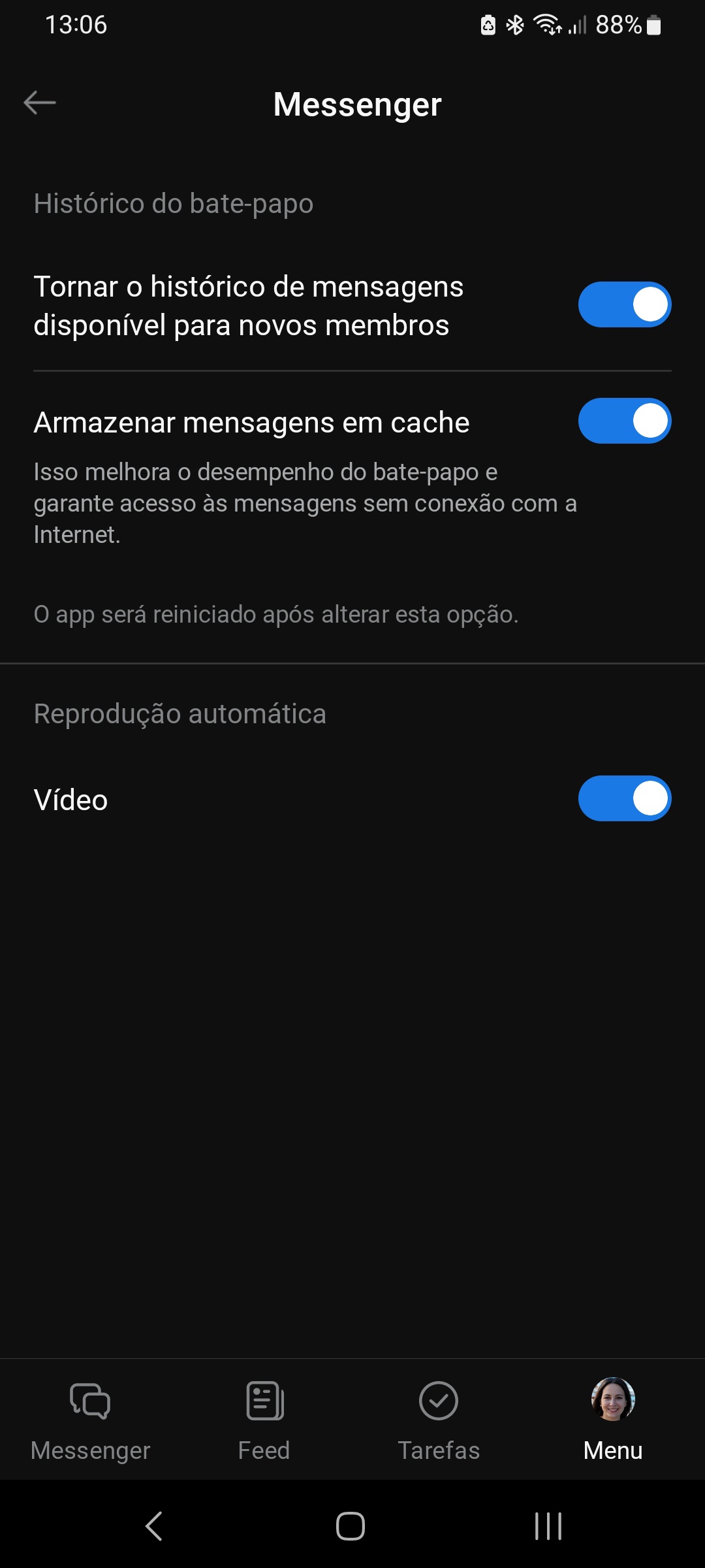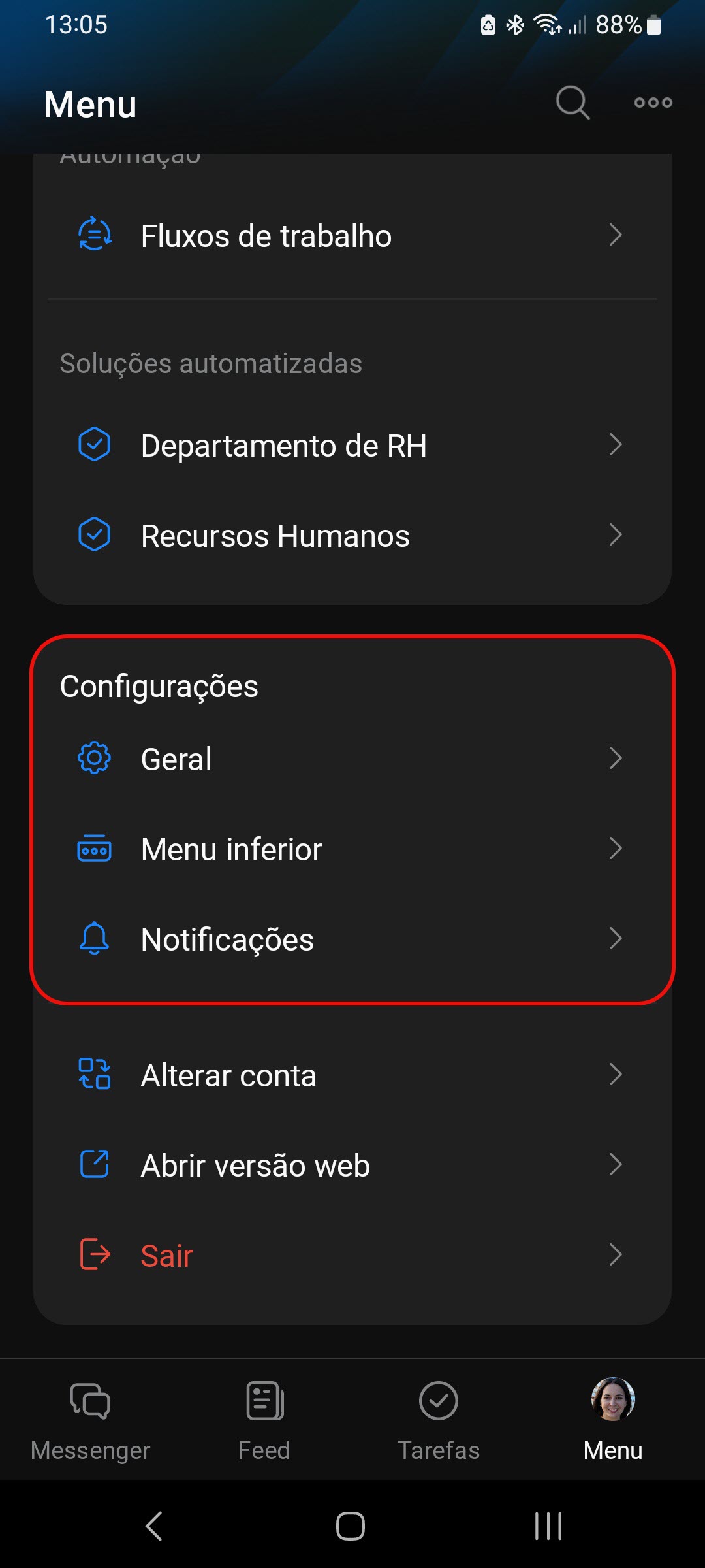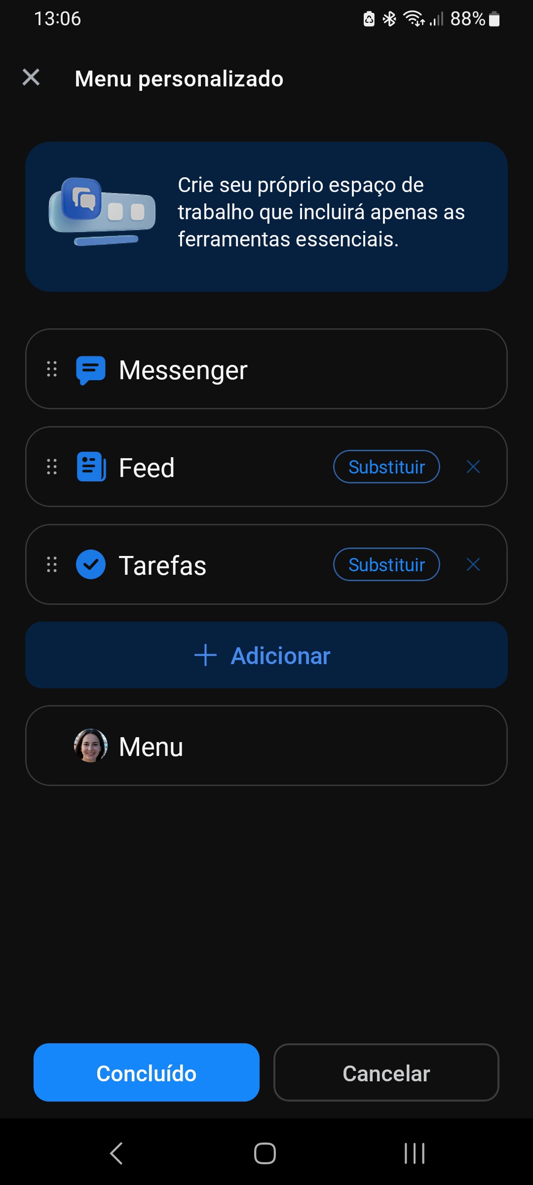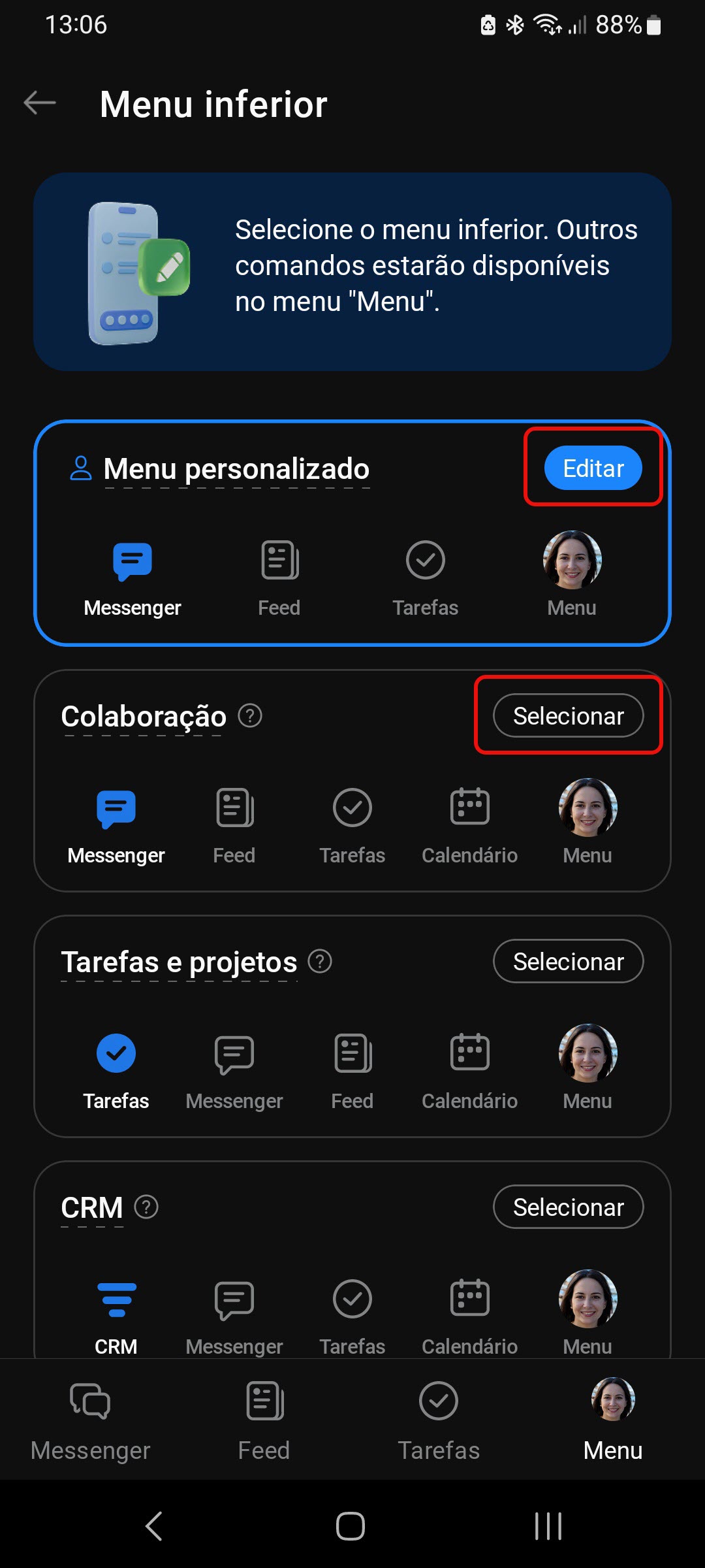 Você pode escolher um menu pré-definido ou criar um personalizado. Por exemplo, se você usa diariamente os chats e o Feed, selecione o menu Colaboração.