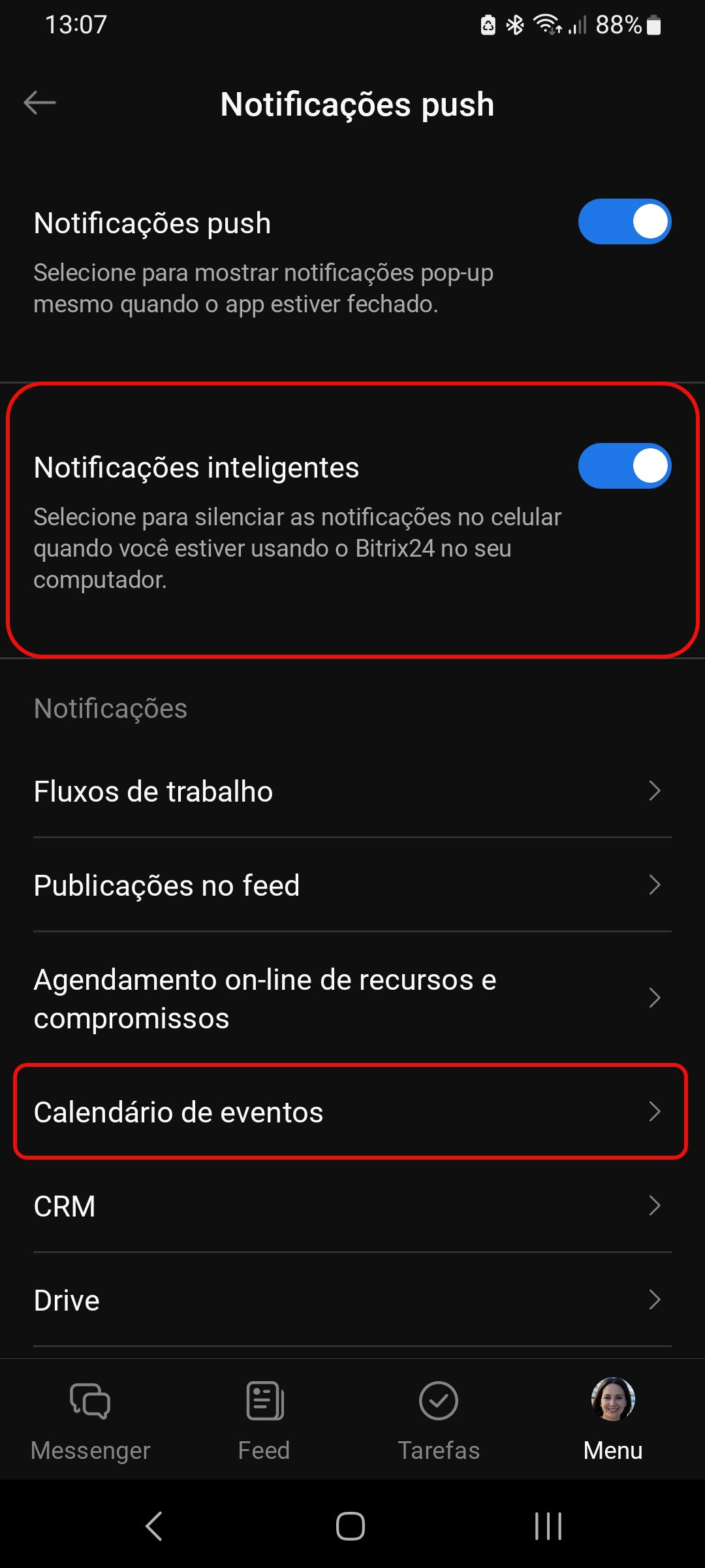 Notificações. Configure quais notificações você deseja receber. Ative as Notificações inteligentes para não receber notificações no celular enquanto trabalha no Bitrix24 pelo seu computador.