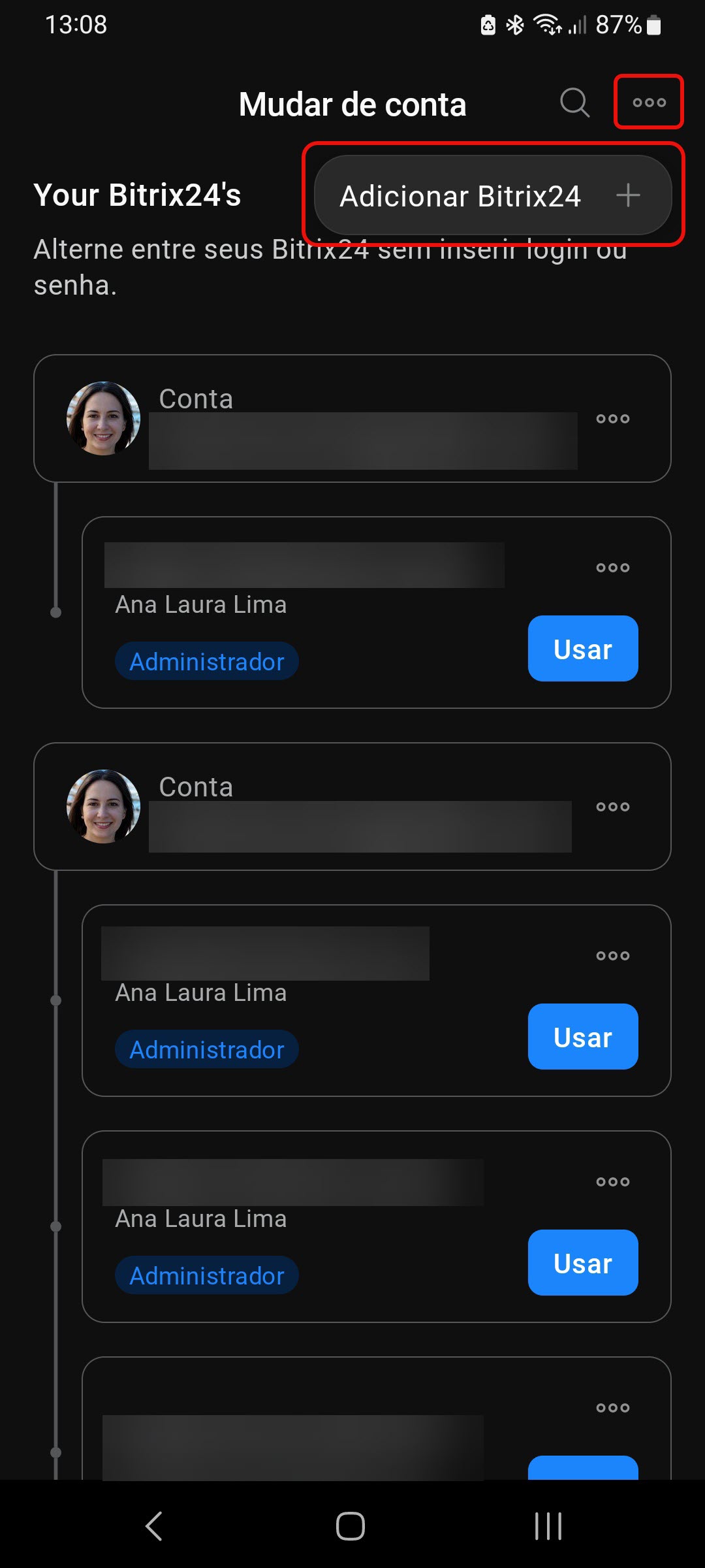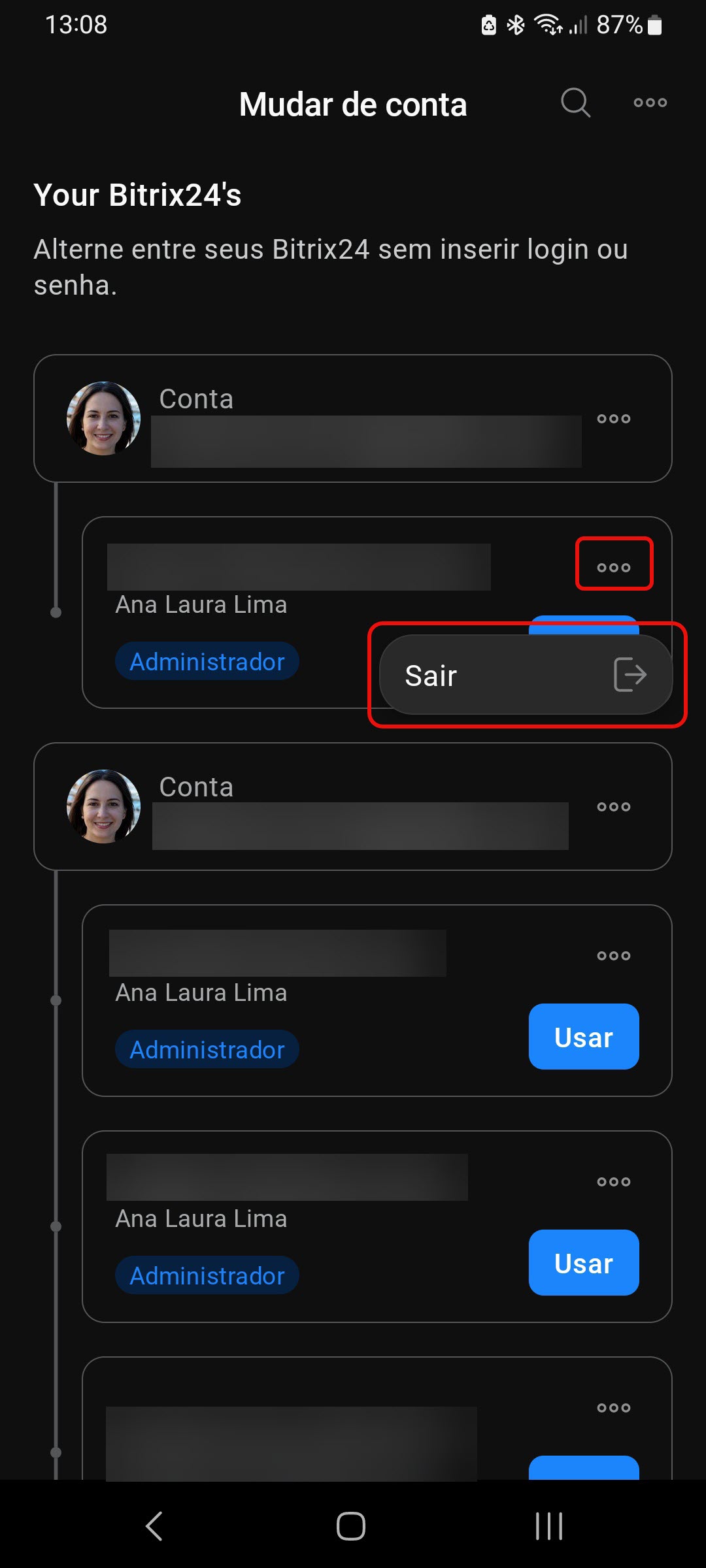 - Mudar para outra conta do Bitrix24 tocando em Usar.