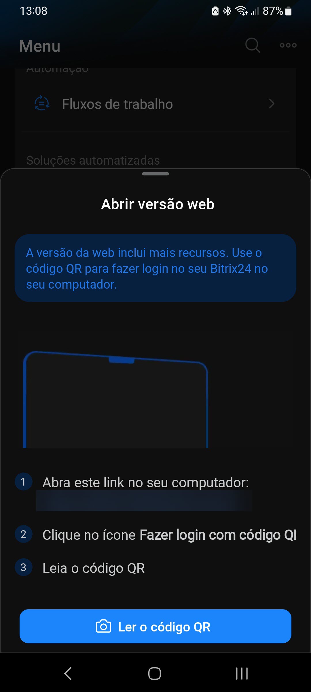 Acessar do computador. Você pode fazer login no Bitrix24 pelo seu computador sem precisar inserir usuário e senha manualmente. Basta selecionar Abrir a versão web e escanear o código QR.