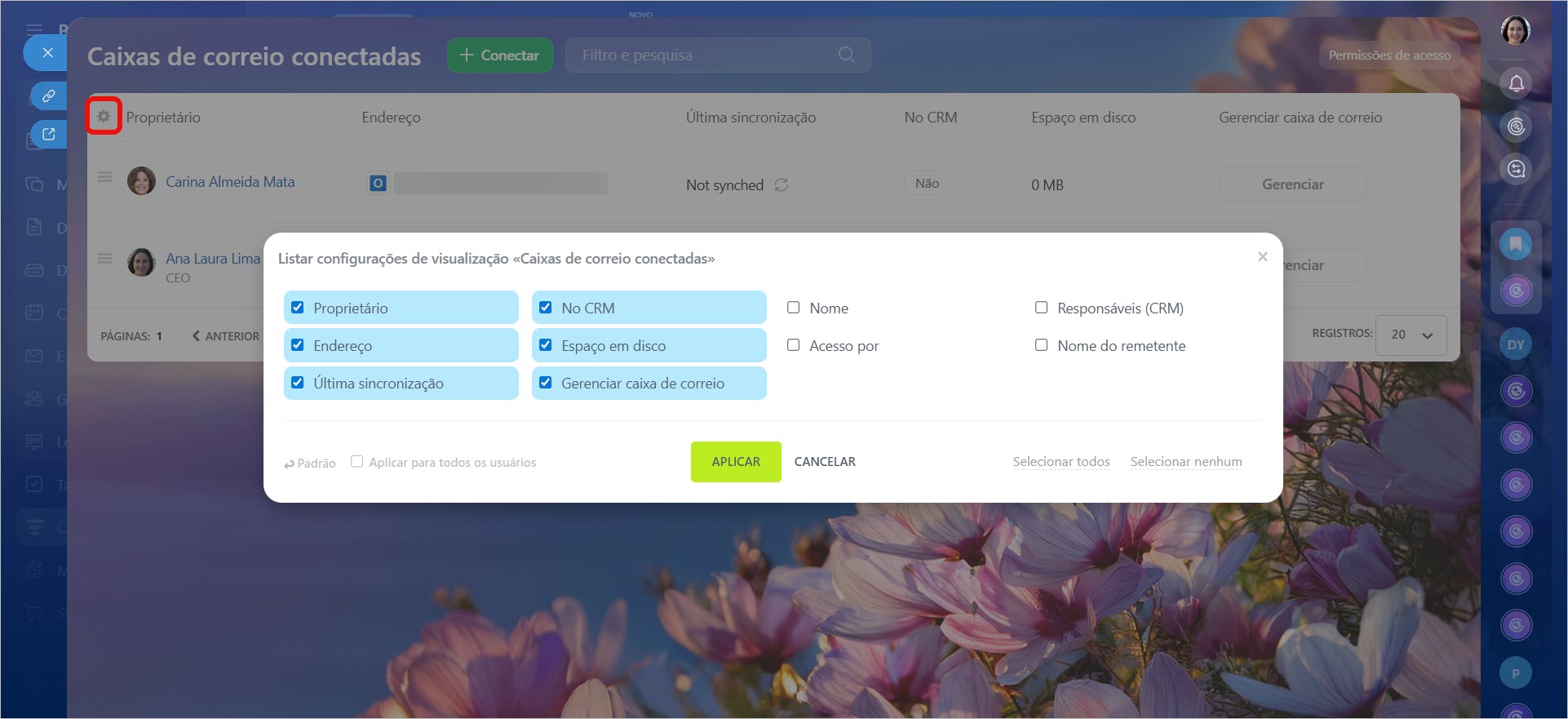 Na seção Gestão de caixas de e-mail dos colaboradores, é exibida a lista completa de caixas conectadas. Você pode personalizar as colunas da tabela para mostrar apenas os dados necessários, como o nome do usuário, endereço da caixa de e-mail e data da última sincronização.