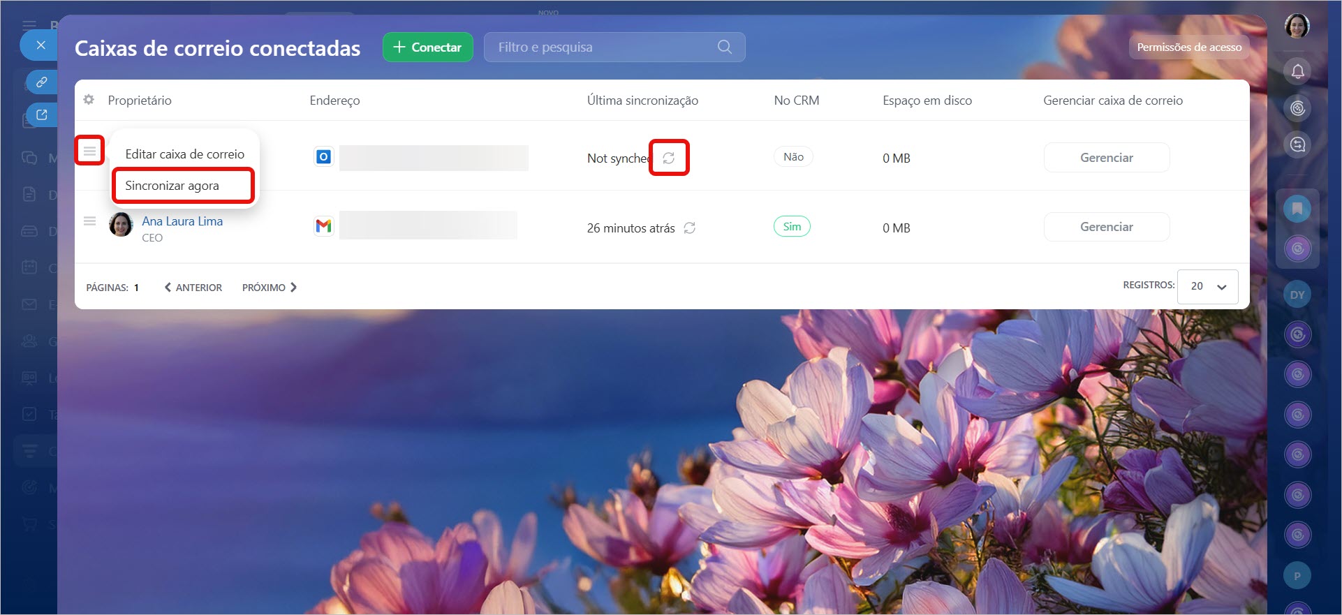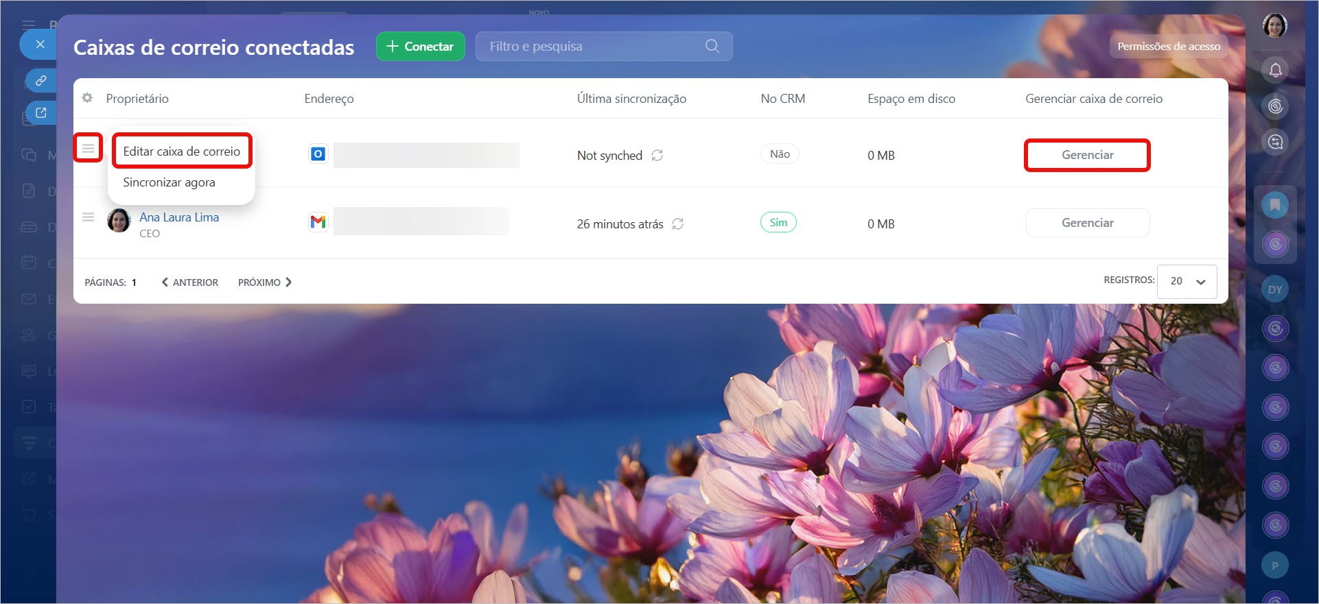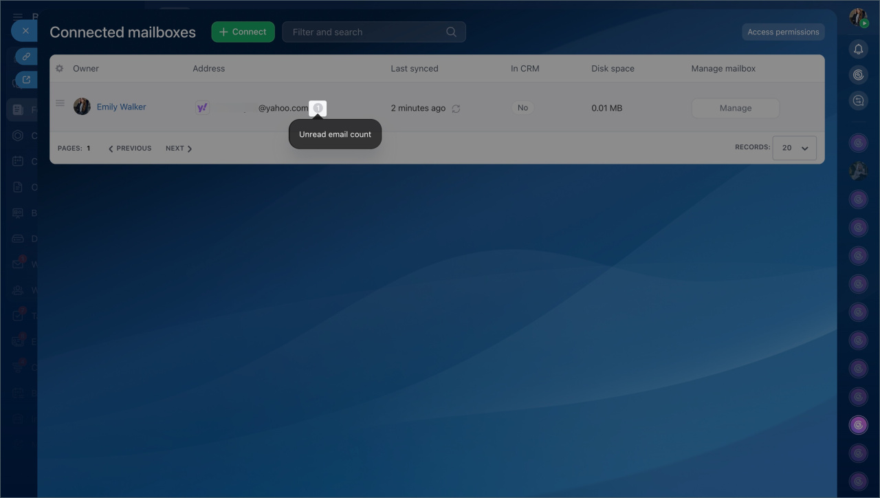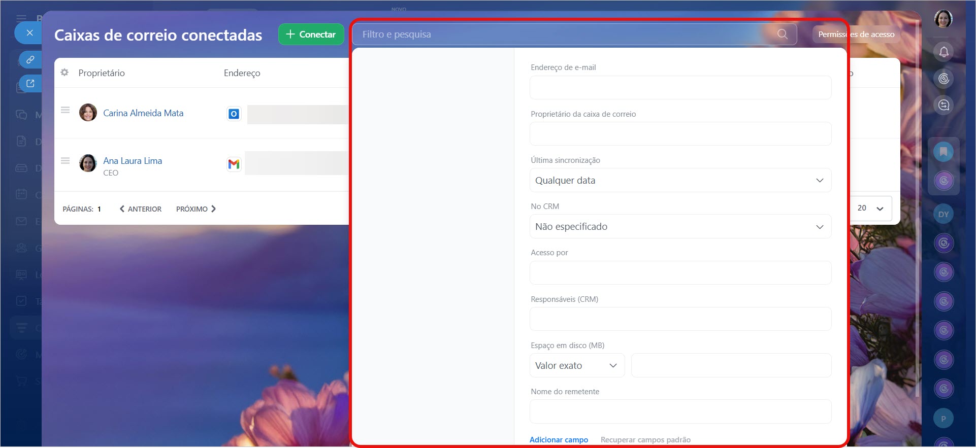 Se sua empresa possui muitas caixas de e-mail conectadas, buscar manualmente a que você precisa pode ser ineficiente. Os filtros ajudam a encontrar rapidamente os dados sem precisar revisar toda a lista. Por exemplo, você pode exibir apenas as caixas com integração ao CRM habilitada ou aquelas que não foram sincronizadas recentemente.