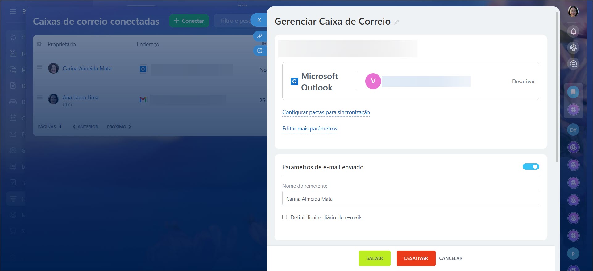 Editar. Altere os parâmetros de conexão, atualize a senha, modifique o nome do remetente ou ative configurações adicionais, como a conexão com o CRM.