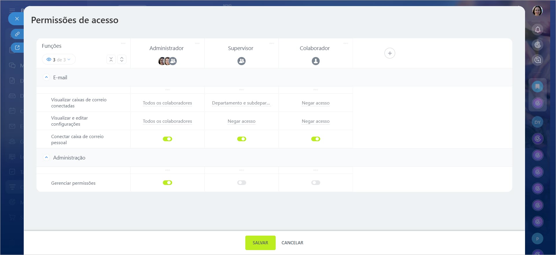 - Acesso por: quem pode trabalhar com essa caixa de e-mail.