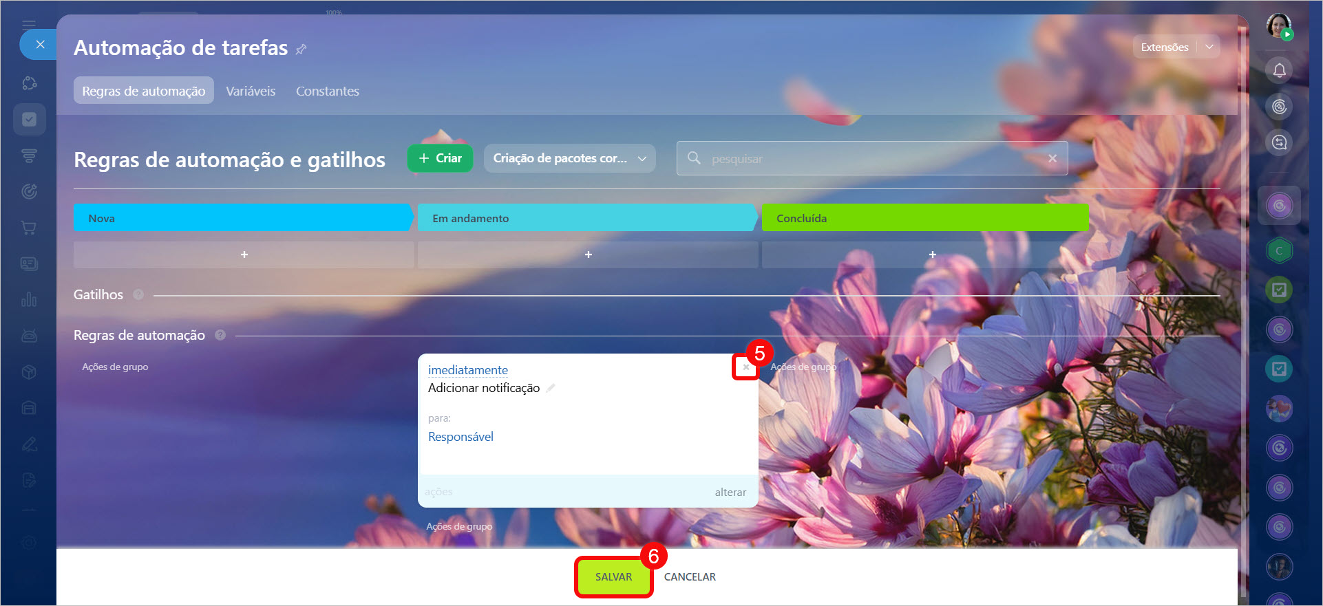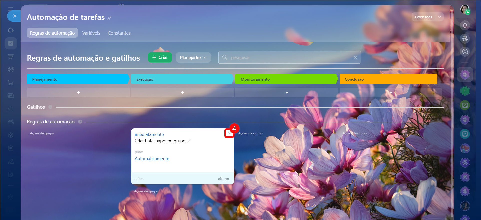 - Acesse a seção Tarefas e projetos > Tarefas/Projetos > Regras de automação. Clique no ícone X para excluir regras ou gatilhos desnecessários.